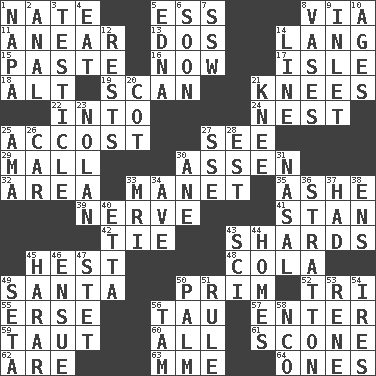 ACROSS 1. Nathan's nickname 5. Double-curved letter 8. By way of 11. Approach 13. Two (Sp.) 14. Long (Scottish) 15. Thick mixture 16. At this time 17. Small island 18. Keyboard modifier key 19. Examine hastily 21. Leg joints 22. To the inside or interior of 24. A home for chicks 25. Buttonhole 27. Observe 29. Promenade 30. NE Netherlands city 32. Type of rug 33. French painter Edouard 35. American tennis player Robert 39. Effrontery 41. Comedian Laurel of Laurel & Hardy 42. Make a knot 43. Pottery fragments 45. Command 48. Root beer relative 49. Before Barbara or Clara 50. Demure 52. Three (prefix) 55. Celtic language 56. The 19th letter of the Greek alphabet 57. Keyboard key 59. Pulled tight 60. 100% 61. Biscuitlike quick bread 62. "We ___ not amused" (Victoria) 63. Madame (abbr.) 64. Singles DOWN 1. California wine valley 2. Of or related to the anus 3. One of the two male reproductive glands 4. Consume 5. Pulitzer Prize-winning author Ferber 6. Within a short period 7. Compass dir. 8. Flower holders 9. An arm off of a larger body of water 10. Matures 12. Musical pauses 14. Actor's bit 20. Small bed 21. Leg joint 23. Pitcher Ryan 25. Nanny (var.) 26. Automobile 27. Compass dir. 28. Eastern Standard Time (abbr.) 30. One (Scot) 31. Rhinal 33. Medical imaging device (abbr.) 34. "___ Maria" 36. Ski resort town in Vermont 37. Possessed 38. Followers of ems 40. Singer James 43. _-fi 44. Residences 45. Ethiopian city, capital of Harari 46. Follow as a consequence or result 47. Proofreading order 49. Bristle 50. Inside of hand 51. General guideline 53. French philosopher Descartes 54. Angers 56. Scottish cap 58. Non-commissioned officer (abbr.)