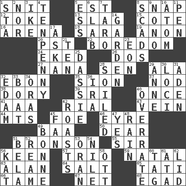 ACROSS 1. In a ____ (agitated or irritated) 5. Eastern Standard Time (abbr.) 8. Fastener 12. Puff or smoke 13. Volcanic refuse 15. ____ d'Azur (French Riviera) 16. Sports stadium 18. "Two Mules for Sister ____" 19. At once, immediately (arch.) 20. Pacific Standard Time (abbr.) 22. Mood resulting from idleness 24. Made supply last 26. Two (Sp.) 27. Grandmother 28. Elected rep. 29. In the manner of 32. Inky black, to poets 35. The Jewish people; Israel 37. Allow head to fall sleepily 38. Small, narrow, flatbottom fishing boat 39. _ Lanka 40. At one time in the past 41. Auto club (abbr.) 42. Monetary unit of Yemen 43. Distinctive style or manner 44. Mountains (abbr.) 45. Enemy 46. Jane of fiction 49. Sound made by sheep 50. Letter starter 51. "Death Wish" actor 55. Title for a knight 56. Peachy ____! 57. Musical group of three 59. Brizilian seaport 63. ____ Jay Lerner 64. Table seasoning 65. Jacques of French films 66. Not wild 67. Fish or hair follower 68. Mild oath DOWN 1. R.R. building 2. And not 3. D.D.E's nickname 4. 3-inch nail 5. Double-curved letter 6. Thick slice 7. Edible starchy tuberous root 8. Tons 9. Words to Nanette 10. Tiny particle 11. Animal enclosure 14. Place where plants grow 17. "____ silly question..." 21. Nine, plus one 23. Period of immesurable duration 25. Hyrax 28. Dirtied 29. Singer Murray 30. Locales 31. An important port of Yemen 32. Dutch treat 33. Water vessel 34. Mouths or openings 36. Lyricist Gershwin 40. Make much ado about nothing 42. Ridicules or criticizes harshly 45. Air blower 47. Affirmative reply 48. Precipitation 49. Maid-servant 51. Actor Lugosi 52. 480, 500 or 516 sheets of paper 53. NW Algerian seaport 54. "Death on the ____" 56. Krazy ___ of comics 58. Baseball player Mel 60. Label 61. _ moment's notice (2 wds.) 62. Flaplike covering