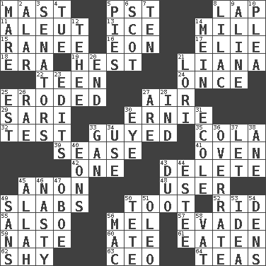 ACROSS 1. Vertical spar for supporting sails 5. Pacific Standard Time (abbr.) 8. Infant locale 11. Native American of Southwest Alaska 13. Frozen water 14. Place where flour is made 15. The wife of a rajah (variant) 16. Age 17. Writer Wiesel 18. Epoch 19. Command 21. Climbing, woody, usually tropical vines 22. Adolescent 24. Single time 25. Eaten away 27. Atmosphere 29. Indian skirt 30. Bert's buddy 32. Trial 33. Mocked 35. Root beer relative 39. Gospel singer Marvin 41. Baking chamber 42. Single 43. Keyboard key 45. At once, immediately (arch.) 48. One who uses or employs something 49. Broad, flat, thick pieces 50. A blast of a horn 52. To free from 55. In addition 56. Cartoonist voice _ Blanc 57. Elude 59. Nathan's nickname 60. Had dinner 61. Ingested 62. Like a shrinking violet 63. Corporate head (abbr.) 64. Beverages made from leaves DOWN 1. Female horse 2. Having or resembling wings 3. Legislators 4. Third day of the wk. 5. Sliced desserts 6. Highlander 7. "___ Little Indians" 8. Pale purple color 9. Place in a line 10. Entreaty 12. Giggle 14. Chow _ 20. Conclusion 21. Australian parrot (variant) 23. Proofreads 25. Eastern Standard Time (abbr.) 26. Actress Charlotte 27. "We ___ not amused" (Victoria) 28. Working for oneself (abbr.) 30. Sight organ 31. Learning spot: Fr. 33. Separate the seeds from cotton 34. Purpose 36. Make much ado about nothing 37. Allow 38. One (Scot) 40. Immeasurably long periods of time 43. Superhero pair 44. First name in cosmetics 45. Assad's deity 46. Thoroughly unpleasant 47. Mitch Miller's instrument 49. Without 50. False hair 51. Butter sub 53. It may be bright or harebrained 54. Cub Scout units 56. Apple computer (short form) 58. Large container