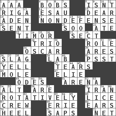 ACROSS 1. American Automobile Association (abbr.) 4. Moves up and down 8. Is not 12. Capital of Latvia 14. He sold his birthright 15. Letter starter 16. An important port of Yemen 17. Unrelated to defense, as in spending 20. Posted 21. "Barney Miller" actor Jack 22. Had dinner 23. The easternmost of the Lesser Sundas 27. Religious group 29. Musical group of three 31. Hero or heavy, e.g. 34. Witty Wilde 35. Ancient Greek god of war 36. Volcanic refuse 39. Experiment locale 41. Inconspicuous attention getter 42. Shout 43. Pulls into pieces 46. Undercover agent 47. Writer Wiesel 48. Lyric poems 51. Sports stadium 54. Keyboard modifier key 56. "We ___ not amused" (Victoria) 58. SW Asia republic 61. Rotating or pertaining to rotation 66. Louse (plural) 67. Ship's personnel 68. One of the Great Lakes 69. Hearing organs 70. Person who is morally reprehensible 71. Plant excrements 72. Fish or hair follower DOWN 1. Caspian sea tributary 2. Helper 3. Representative 4. Benjamin's nick name 5. Bear (Spanish) 6. Prohibit 7. Soap bubbles 8. Binary compound 9. Elected representatives 10. Political cartoonist Thomas 11. Woody plant 13. Opposed to 18. Greek goddess of the dawn 19. Enemy 24. Mountains (abbr.) 25. The grampus (Milton) 26. Monetary unit of Yemen 28. Dice game 30. Declaim 32. French article 33. Eastern Standard Time (abbr.) 34. Stared 36. Symbol (abbr.) 37. Lion 38. One to whom something is allotted 40. Actor Lugosi 44. Atmosphere 45. To riddle 49. Erode 50. _ Lanka 52. The longest river in the world 53. Believer in; advocate of (suffix) 54. Bowlike part 55. Old wives' tales, e.g. 57. Nights before holidays 59. Measure of real estate 60. A home for chicks 62. Leather borer 63. Period 64. Mouth edge 65. Affirmative reply