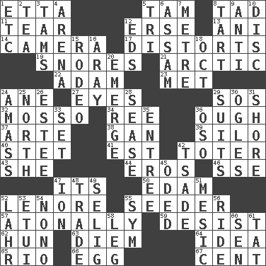 ACROSS 1. Singer James 5. Scottish cap 8. Small amount or degree 11. Rend 12. Celtic language 13. Cuckoo 14. Device for capturing images 17. What propaganda does 19. Sounds asleep 21. Northern region 22. First man 23. Was introduced to 24. A saturated hydrocarbon 27. Sight organs 29. Mayday 32. With motion or animation 34. To riddle 36. Ending for "Through" and "Enough" 37. Johnson of "Laugh-In" 38. Separate the seeds from cotton 39. Grain storage tower 40. Proofreading order 41. Eastern Standard Time (abbr.) 42. Carrier 43. A female animal or person 44. Greek god of love 46. Compass dir. 47. ___ a Wonderful Life 50. Dutch treat 52. Poe poem 55. Sowing specialist 57. Without tonality 59. Cease 62. Attila the _ 63. South Vietnam president (1954) 64. It may be bright or harebrained 65. _ de Janeiro 66. Ovum 67. Penny DOWN 1. And so on (abbr.) 2. Beverage made from leaves 3. Scottish caps 4. Sports stadium 5. Three (prefix) 6. Indian state 7. Distance measurement (Brit.) 8. Small pie 9. Against 10. Flat circle 12. Begley and Asner 15. Cowboy competition 16. Like ___ of sunshine 18. Sep. follower 20. Develop 24. Collect or gather 25. Compass direction 26. First name in cosmetics 28. Gospel singer Marvin 29. Sets or collections 30. Stares at amorously 31. Dinah or Pauly 33. Arrange properly for use 35. Main course 36. Bear (Spanish) 42. Sadhe (variant) 45. Wrote a lyric poem 47. Electrically charged atom 48. Buy and sell 49. Former Milwaukee Brewers owner Bud 51. Mesonic 52. Cowardly lion portrayer 53. Needle case 54. Words to Nanette 55. Symbol (abbr.) 56. Travel on an animal 58. Part of a journey 60. Elected rep. 61. Make lace