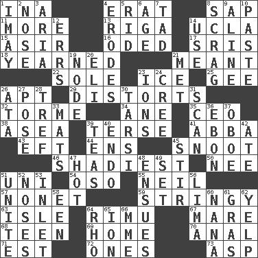 ACROSS 1. _ tizzy (2 wds.) 4. Part of Q.E.F. 8. Plant excrement 11. Greater amount 13. Port city in Latvia 14. Southern CA. univ. 15. SW Saudi Arabia district 16. Wrote a lyric poem 17. Indian titles of respect 18. Had a strong desire 21. Intended 22. Flatfish 23. Frozen water 25. Unit of force equal to gravity 26. Fitting 29. What propaganda does 32. Singer Mel 34. A saturated hydrocarbon 35. Corporate head (abbr.) 38. Toward the sea 39. Laconic 41. Swedish rock group 43. Newt 44. Followers of ems 45. Snout, nose 46. Most questionable 50. Born 51. Single; one (prefix) 54. Bear (Spanish) 55. Famous astronaut Armstrong 57. Music written for nine 59. Slender, wiry 63. Small island 64. Tall New Zealand timber tree 67. Female horse 68. Adolescent 69. Dwelling 70. Of or related to the anus 71. Eastern Standard Time (abbr.) 72. Singles 73. Viper DOWN 1. "If ____ say so..." 2. Olfactory organ 3. Roberta Peters solo 4. Eats (away) 5. To free from 6. Grow older 7. Small amount or degree 8. Lean end of the neck 9. Place in a line 10. Thick mixture 12. Blunders 14. Purpose 19. Connecting point 20. Connecticut Ivy Leaguer 21. Was introduced to 23. Charged atoms 24. Algonquian 26. _ moment's notice (2 wds.) 27. Airs 28. Unclean, religiously 30. Tarsus (plural) 31. Examine minutely or intensely 33. Floor coverings 36. Inky black, to poets 37. Mitch Miller's instrument 39. Beverages made from leaves 40. Inside; within (prefix) 42. Had dinner 45. Move through with a circular motion 47. Being at a high temperature 48. Takes place subsequently 49. Put into a specified state 51. Join together 52. Olfactory organs 53. An arm off of a larger body of water 56. Pale green bean 58. Car or cant ending 60. Nanny 61. Pate de foie ____ 62. Sharp bark 64. 17th letter of the Greek alphabet 65. Electrically charged atom 66. Madame (abbr.)