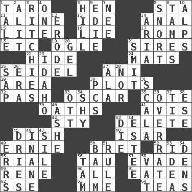 ACROSS 1. Edible starchy tuberous root 5. Layer 8. R.R. building 11. Place in a line 13. Binary compound 14. Of or related to the anus 15. 61 cubic inches 16. Falsehood 17. Frolic 18. And so on (abbr.) 19. Stare 21. Founders of families 22. Flintstone garb 24. Floor protectors 25. Beer mug 27. Cuckoo 29. Length times width 30. Schemes 32. Romantic infatuation 33. Motion picture award 35. ____ d'Azur (French Riviera) 39. Expletives 41. Advice 42. Filthy place 43. Erase 45. Food container 48. Austrian river, tributary to the Danube 49. Bert's buddy 50. Cy Young winner Saberhagen 52. To free from 55. Monetary unit of Yemen 56. The 19th letter of the Greek alphabet 57. Dodge 59. French philosopher Descartes 60. Everything 61. Eroded 62. Compass dir. 63. Madame (abbr.) 64. Afternoon social gatherings DOWN 1. Lie 2. Came down and settled, as after flight 3. Actors Guy, Robert Welles, and Clint 4. Single 5. Land elevation 6. Singer Brickell 7. Born 8. Derisive sound 9. Domesticates 10. High mountains 12. Wear away 14. Roberta Peters solo 20. Set 21. Stricken, poetically 23. Potato state 25. Plant excrement 26. Epoch 27. In the manner of 28. Or not 30. Personal Computers (abbr.) 31. Any of the three canals of the cochlea 33. Baseball player Mel 34. Like a shrinking violet 36. Make much ado about nothing 37. Teat (slang) 38. Compass dir. 40. American tennis player Robert 43. Pass on 44. First name in cosmetics 45. Frees from moisture 46. Silly 47. Filth; sediment 49. Blunders 50. Lip ointment 51. Governing power 53. It may be bright or harebrained 54. Habitations of wild animals 56. Scottish cap 58. Large container