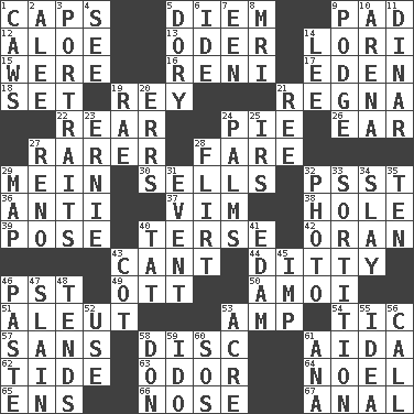 ACROSS 1. Balmoral and tarboosh 5. South Vietnam president (1954) 9. Writing tablet 12. Medicinal plant 13. River in Europe 14. Australian parrot (variant) 15. Past tense of be (plural) 16. Painter Guido (1575-1642) 17. Genesis locale 18. Arrange properly for use 19. Marina Del _, California 21. Canadian anthropologist Darnell 22. Tail end 24. Sliced dessert 26. Ewer handle 27. More valued for its uncommonness 28. Conductor's collection 29. Chow _ 30. Makes a sale 32. Inconspicuous attention getter 36. Opposed to 37. Zeal 38. Hollow 39. Introduce or present, as a question 40. Laconic 42. NW Algerian seaport 43. Patter 44. Simple song 46. Pacific Standard Time (abbr.) 49. Baseball player Mel 50. Mine, in Marseilles 51. Eskimo relative 53. Electrical Unit 54. Nervous spasm 57. Without 58. Compact _ 61. Opera by Verdi 62. Periodic rise and fall of the sea level 63. Aroma 64. Christmas carol 65. Followers of ems 66. Sense of smell 67. Of or related to the anus DOWN 1. Crow sounds 2. Toward shelter 3. Likenesses of persons 4. Observe 5. Dinghy 6. Binary compound 7. Car or cant ending 8. Medical imaging device (abbr.) 9. Plash 10. Sports stadium 11. Middle Eastern gold or silver currency 14. Area sheltered from the wind 19. Actress Charlotte 20. Blunders 21. To sift 23. Bert's buddy 24. Insides of hands 25. Big collection agency 27. Former U.S. Attorney General Janet 28. Seductive woman who exploits men 29. Atlas unit 31. Happening 32. Picture 33. Determination 34. Kill 35. Nine, plus one 40. Make lace 41. Dutch treat 43. Small bed 45. Mischievous child 46. Thick mixture 47. Killed 48. Is inclined (to) 52. Purpose 53. 1/640 square mile 55. The main thing one is thinking about 56. Give a ring to 58. Spanish title 59. Wedding promise 60. Mayday 61. Santa ___, CA