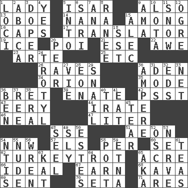 ACROSS 1. Kenny Rogers chart-topper in '80 5. Austrian river, tributary to the Danube 9. In addition 13. Mitch Miller's instrument 14. Grandmother 15. Amid 16. Balmoral and tarboosh 17. Interpreter 19. Frozen water 20. Luau course 21. Compass dir. 22. Deep reverence 23. Johnson of "Laugh-In" 25. And so on (abbr.) 26. All-night dance parties 30. An important port of Yemen 34. Greek mythologigal hunter 35. Method 36. Cy Young winner Saberhagen 39. Related on the mother's side 42. Inconspicuous attention getter 43. Suggestive of the supernatural 44. Feeling or showing extreme anger 46. Anneal 47. 61 cubic inches 48. Compass dir. 51. Period of immesurable duration 54. Compass dir. 57. Raised railways 58. For each 60. Put into a specified state 62. Ragtime dance 65. 43,560 square feet 66. Perfect 67. Merit 68. Polynesian shrub of the pepper family 69. Transmitted 70. Bristle 71. Ancient Greek god of war DOWN 1. Event scenes 2. Phillipine bananalike plant 3. Drug addict 4. It is so 5. To the inside or interior of 6. Indian skirt 7. Santa ___, CA 8. The wife of a rajah (variant) 9. Housemaid (var.) 10. Globular water bottle used in Asia 11. Overwhelm 12. Legendary monster 15. Actor Baldwin 18. Fast jet (abbr.) 20. Lightbulb-shaped fruit 24. Trinitrotoluene 27. Compete 28. Age 29. Slow-paced one 30. Electrical Unit 31. Two (Sp.) 32. Begley and Asner 33. Fish or hair follower 36. Benjamin's nick name 37. Portuguese money of account (variant) 38. Epoch 40. Three (prefix) 41. Ingest 45. Pull apart 48. Stitch closed the eyes of (a falcon) 49. Cunning 50. _____ Park, CO 52. Motion picture award 53. Boldness 54. Nuclear Threat Initiatives 55. Naked 56. Songbird 58. Left side of a ship or aircraft 59. Inactive volcano in Sicily 61. Beverages made from leaves 63. Krazy ___ of comics 64. Actress Charlotte 65. Alias (abbr.)