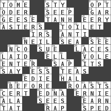 ACROSS 1. Heavy book 5. Filthy place 8. Choose 11. Baltic tributary 12. Ooze 14. Slender fish 15. Honkers 17. Hyperbolic tangent 18. Suggestive of the supernatural 19. Michaelmas daisies 21. Bathroom plumbing fixture 23. Big collection agency 25. Opposed to 26. Famous astronaut Armstrong 27. Ocean 28. Perceive with the eye 31. Non-commissioned officer (abbr.) 33. Institute legal proceedings 35. Shoestrings 37. Put down 38. Pipe bend 40. Grand slam 41. Keyboard key 43. Plant excrement 45. ___ a Wonderful Life 46. Declare 47. Double-curved letter 50. Afternoon social gatherings 52. Singer Brickell 53. Actor Linden 54. Prior to 56. Exposes to great heat 61. An absolute certainty 62. Pulitzer Prize-winning author Ferber 65. Bert's buddy 66. Chicken ___ king 67. Observes 68. Merit 69. Make lace 70. Strike 71. Broke a traffic law DOWN 1. Ancient Roman robe 2. Lyric poems 3. Rendezvous 4. Celtic language 5. Fast jet (abbr.) 6. Beverage made from leaves 7. Gossips 8. Double curve, resembling the letter S 9. Component 10. Attempt 13. Give a jingle 16. 4th largest of the Great Lakes 18. Biblical high priest 20. Indian titles of respect 22. Slanted text style (abbr.) 24. Turn sharply 26. Connecting point 28. Native of Scotland 29. Snakelike fish 30. Compass dir. 31. Nanny 32. Municipality 34. Raised railways 36. Advice 37. French article 39. Thin strip of wood or metal 42. Do over again 44. Lightbulb-shaped fruit 48. Titles for men of rank and authority 49. Sowing specialist 51. Medicinal plant 52. Lizard (obsolete) 54. Actor Lugosi 55. Part of Q.E.F. 57. Ancient Greek god of war 58. Fastener 59. Hoop that covers a wheel 60. Post 61. Feline 63. Teachers' org. 64. Cleo's killer