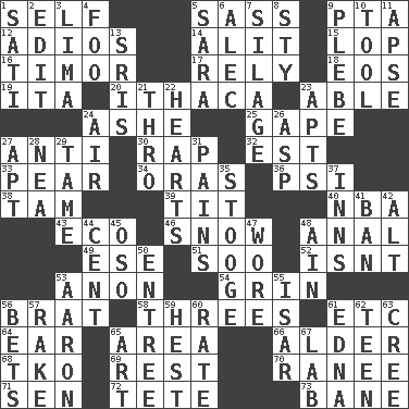 ACROSS 1. Automatic 5. Backtalk 9. Parent Teacher Association (abbr.) 12. Goodbye (Sp.) 14. Came down and settled, as after flight 15. Trim (branches) 16. Southeast Indonesia island 17. Trust 18. Greek goddess of the dawn 19. Call ___ day 20. New York city 23. Competent 24. American tennis player Robert 25. Open wide 27. Opposed to 30. Reproach for some lapse or misdeed 32. Eastern Standard Time (abbr.) 33. Lightbulb-shaped fruit 34. Mouths or openings 36. 23rd letter of the Greek alphabet 38. Scottish cap 39. Teat (slang) 40. Basketball assoc. 43. Environmental prefix 46. Frozen precipitation 48. Of or related to the anus 49. Compass dir. 51. "Barney Miller" actor Jack 52. Is not 53. At once, immediately (arch.) 54. Broad smile 56. Naughty child 58. Triads 61. And so on (abbr.) 64. Ewer handle 65. Length times width 66. Tree or shrub in the Birch family 68. Ring climax 69. Repose 70. The wife of a rajah (variant) 71. Elected rep. 72. False hair 73. Object of repulsion DOWN 1. Suttee (variant) 2. Prepare for publication 3. Pale green bean 4. Egg _ yung 5. "Two Mules for Sister ____" 6. Actor Baldwin 7. Fodder prepared in a silo 8. Filthy place 9. Military trainee 10. Implement 11. Domed church section 13. Indian titles of respect 21. Through, poetically 22. Centers 23. Tenement units (abbr.) 24. Atmosphere 26. Cleo's killer 27. Fitting 28. Teachers' org. 29. Not wild 31. Aches 35. Moe Howard, for one 37. Lodging establishments 41. Forbid 42. Keyboard modifier key 44. Penny 45. Bear (Spanish) 47. Had on 48. The 18th letter of the Arabic alphabet 50. Main course 53. Composer Copland 55. Austrian river, tributary to the Danube 56. Wagers 57. Libertine 59. Command 60. Assign a rank or rating to 61. Pulitzer Prize-winning author Ferber 62. Adolescent 63. Algonquian 65. Nonscientific branch of learning 67. Experiment locale