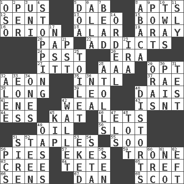 ACROSS 1. Musical composition 5. Apply (a substance) by light strokes 8. Flats, for short 12. Emitted 13. Butter sub 15. Soup holder 16. Constellation of myth 18. Having or resembling wings 19. Like ___ of sunshine 20. Infant food 22. Inveterate users 24. Inconspicuous attention getter 26. Period 27. "Tell ____ the Marines!" 28. Auto club (abbr.) 29. Choose 32. A really long time 35. International (abbr.) 37. Actress Charlotte 38. Protracted 39. Lion 40. Raised platform 41. Compass dir. 42. Welt 43. Is not 44. Curvy letter 45. Krazy ___ of comics 46. Allows 49. Petroleum 50. Narrow, elongated depression 51. Paper fasteners 55. "Barney Miller" actor Jack 56. Sliced desserts 57. Supplements with great effort 59. Marketplace scale 63. Algonquian 64. False hair 65. Not kosher 66. Elected reps. 67. One of the 12 tribes of Israel 68. Native of Scotland DOWN 1. Bear (Spanish) 2. For each 3. Single; one (prefix) 4. Ceasing 5. ___ good deed 6. Silent film actress Nazimova 7. Necklace unit 8. Phillipine bananalike plant 9. Left side of a ship or aircraft 10. It was, poetically 11. Playfully artful 14. Severe or trying experience 17. Political cartoonist Thomas 21. Pacific Standard Time (abbr.) 23. Lyricist Gershwin 25. Bathroom 28. Ringlike coral islands and reefs 29. Mouths or openings 30. Ache 31. Trial 32. Toward shelter 33. Immeasurably long periods of time 34. Singles 36. Teachers' org. 40. What propaganda does 42. Place for singles 45. Sleep 47. Raised railways 48. A blast of a horn 49. Fertile tracts in a desert 51. Male parent of an animal 52. Adolescent 53. Made supply last 54. Stalk of a moss capsule 56. Personal Computers (abbr.) 58. Elected rep. 60. The grampus (Milton) 61. Modern: prefix 62. Bank Draft (abbr.)