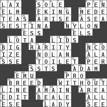 ACROSS 1. Not strict 4. Not divided or shared with others 8. Writing instrument 11. Shade tree 12. Supplementing with great effort 14. Ancient Persian 15. Afternoon social gatherings 17. Get up 18. At sea 19. French poetic form 21. Thermoplastic polyamide 23. Curvy letter 24. Raised railways 25. Globular water bottle used in Asia 27. Hats (slang) 30. Massive 31. Noteworthy scarcity 34. Non-commissioned officer (abbr.) 37. Ending with capital 38. Pitcher Ryan 39. In the manner of 40. Compass dir. 41. Bathroom plumbing fixture 43. For each 44. Fast planes 45. First of billions? 47. Australian flightless bird 49. Adept person 50. A special lineage 52. Sans 56. Actor's bit 57. With great haste 60. Type of rug 61. Prepare for publication 62. Calif. Air Force Base 63. 100% 64. Compass dir. 65. Kenny Rogers chart-topper in '80 66. Perceive with the eye DOWN 1. Allows 2. Toward shelter 3. Dec. holiday 4. Seines 5. Gumbo ingredient 6. Cards in a Roman deck? 7. Followers of ems 8. Mexican monetary units 9. Locale of original sin 10. Teachers' org. 13. Commissioned mil. rank 14. Shopping center 16. Proofreading order 20. Austrian river, tributary to the Danube 22. Consenting reply 25. Belonging to Elizabeth 26. Double curve, resembling the letter S 27. Ms. Damita and namesakes 28. Slanted text style (abbr.) 29. Unit of force 30. Again 32. Pismires 33. Carrot, for example 34. California wine valley 35. To starve (Brit.) 36. Boat paddle 42. Small pie 44. Take to court 46. Capital of the state of Qatar 47. Bert's buddy 48. Confront 49. Abounding in pines 50. Auction offers 51. Pat or tap gently 52. Rampant 53. Mouths or openings 54. Ubangi River tributary 55. Story 56. Area sheltered from the wind 58. Cartoonist voice _ Blanc 59. Auto club (abbr.)