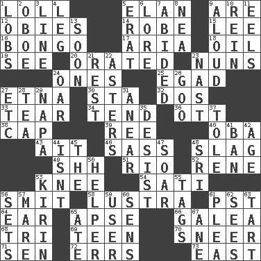 ACROSS 1. Hang loosely or laxly 5. Flair 9. "We ___ not amused" (Victoria) 12. Off-Broadway awards 14. Loose flowing garment 15. Area sheltered from the wind 16. Beat drum 17. Operatic vocal solo 18. Lubricate 19. Observe 20. Spoke pompously 23. Religious women 24. Washington bills 25. Mild oath 27. Inactive volcano in Sicily 30. R.R. building 32. Two (Sp.) 33. Separate forcefully 34. Be inclined (to) 36. Baseball player Mel 38. Head covering 39. To separate or throw off 40. Chief or king in Benin or Nigeria 43. Small island 46. Backtalk 48. Volcanic refuse 49. Quiet! 51. _ de Janeiro 52. French philosopher Descartes 53. Leg joint 54. Suttee (variant) 56. Stricken, poetically 58. A period of five years 61. Pacific Standard Time (abbr.) 64. Ewer handle 65. Domed church section 66. An organ shaped like a helmet 68. Three (prefix) 69. Adolescent 70. Contemptuous expression 71. Elected rep. 72. Blunders 73. Compass direction DOWN 1. Tennis shots 2. Mitch Miller's instrument 3. Actor's bit 4. Part of a journey 5. Part of Q.E.F. 6. Old wives' tales, e.g. 7. Tolerated 8. Teachers' org. 9. Verbally 10. It's straight from the horse's mouth 11. Snakelike fish 13. Within a short period 21. Take ten 22. Michaelmas daisies 23. Political cartoonist Thomas 24. Rowing implement 26. Thick or sticky substance 27. And so on (abbr.) 28. Beverage made from leaves 29. California wine valley 31. Approach 35. Stop 37. Lacquered or enameled metalware 41. Forbid 42. Personal question 44. Is not 45. Definite Article 47. Fly high 48. _ Lanka 50. Aide 53. Japanese brewing company 55. Labels 56. Arranges properly for use 57. Female horse 59. One who makes use of a thing 60. Elected reps. 61. Entreaty 62. Observes 63. Small pie 65. Had dinner 67. One (Scot)