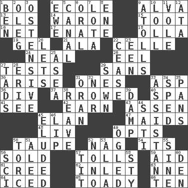 ACROSS 1. Surprise greeting 4. Learning spot: Fr. 9. Inventor's middle name 13. Raised railways 14. Make _____ (do battle with) 15. A blast of a horn 16. Fish or hair follower 17. Maternal 18. Water jar 19. Set 21. According to 22. Cell (Danish) 24. Anneal 26. Snakelike fish 27. Trials 29. Without 30. Get up 31. Singles 33. Viper 36. HTML Container Element 37. Moved like an arrow 40. Health resort 41. Perceive with the eye 42. Merit 43. NE Netherlands city 45. Style 47. Unmarried girls 48. 54 in ancient Rome 49. Chooses 50. Grayish beige 52. Tired old horse 54. It is 56. Exchanged or delivered for money 57. For Whom the Bell _____ 59. Assist 61. Algonquian 62. An arm off of a larger body of water 63. Compass dir. 64. On the rocks 65. Sycophant 66. "___ Little Indians" DOWN 1. Benjamin's nick name 2. Cassini of fashion 3. Clearly or manifestly demonstrative 4. She-sheep 5. Lessep's creation 6. Taken by mouth 7. Globular water bottle used in Asia 8. Compass dir. 9. Ringlike coral islands and reefs 10. Hang loosely or laxly 11. Grand slam 12. "One Day ___ Time" 20. Allows 22. Desist 23. Car or cant ending 25. Toward the sea 27. Small boys 28. One of the Great Lakes 29. Stitched 31. NW Algerian seaport 32. And not 33. Helper 34. Hurried 35. Baking dishes 38. Rob, plunder, or pillage 39. Moist 44. Suttee (variant) 45. Dodged 46. Mouth edge 49. Stared 50. Torque (variant) 51. Toward shelter 52. Words to Nanette 53. Silent film actress Nazimova 55. Trig term 56. _-fi 57. Teat (slang) 58. Filthy place 60. Lair