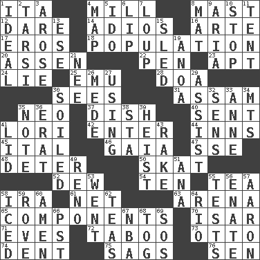 ACROSS 1. Call ___ day 4. Place where flour is made 8. Vertical spar for supporting sails 12. Have the gumption 14. Goodbye (Sp.) 16. Johnson of "Laugh-In" 17. Greek god of love 18. Census information 20. NE Netherlands city 22. Writing instrument 23. Fitting 24. Whopper 25. Australian flightless bird 28. ___ good deed 30. Perceives with the eye 31. Indian state 35. Modern: prefix 37. Food container 40. Emitted 41. Australian parrot (variant) 42. Keyboard key 44. Restaurants 45. Slanted text style (abbr.) 46. Greek goddess of the earth (variant) 47. Compass dir. 48. Prevent from occurring 50. Three-handed card game 52. Morning condensation 54. "___ Little Indians" 55. Afternoon social gathering 58. Retirement account (abbr.) 61. Fish or hair follower 63. Sports stadium 65. Pieces 70. Austrian river, tributary to the Danube 71. Nights before holidays 72. Off limits 73. Von Bismarck 74. Incision 75. Sinks 76. Elected rep. DOWN 1. Perfect 2. Tarsus (plural) 3. Came up 4. Atlas unit 5. Wedding promise 6. Mouth edge 7. Central Nebraska county 8. Floor covering 9. Roberta Peters solo 10. Constrict 11. Portable shelter 13. Compass dir. 15. Downhill vehicle 19. Small Philippine buffalo 21. Born 26. Ancient Persian 27. Exploiting 29. Aid 30. Dirtied 32. Elected reps. 33. Queen of England 1702-14 34. Mountains (abbr.) 35. Observe 36. Part of Q.E.F. 38. R.R. building 39. Robbery 41. Flaplike covering 43. Immoral or dissolute person 49. Former U.S. Attorney General Janet 51. Santa ___, CA 53. Gone 55. Trials 56. Maternal 57. Composer Copland 58. On the rocks 59. Be footloose 60. So be it 62. Beverages made from leaves 64. _ de Janeiro 66. Pacific Standard Time (abbr.) 67. Basketball assoc. 68. Coat; cloak 69. Distress signal