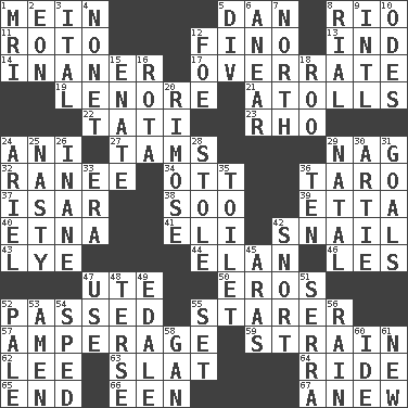 ACROSS 1. Count _ (2 wds.) 5. Daniel's nick name 8. _ de Janeiro 11. Printing process, for short 12. A pale, very dry sherry 13. Working for oneself (abbr.) 14. Sillier 17. Make much ado about nothing 19. Poe poem 21. Ringlike coral islands and reefs 22. Jacques of French films 23. 17th letter of the Greek alphabet 24. Cuckoo 27. Scottish caps 29. Tired old horse 32. Indian princess (variant) 34. Baseball player Mel 36. Edible starchy tuberous root 37. Austrian river, tributary to the Danube 38. "Barney Miller" actor Jack 39. Singer James 40. Inactive volcano in Sicily 41. Biblical high priest 42. Slow-paced one 43. Sodium hydroxide 44. Enthusiasm 46. French article 47. Shoshoni 50. Greek god of love 52. Went by 55. A viewer who gazes fixedly 57. Electrical Measurement 59. Put through a sieve 62. Area sheltered from the wind 63. Narrow board 64. Travel on an animal 65. Conclusion 66. Car or cant ending 67. Afresh DOWN 1. Medical imaging device (abbr.) 2. Period of immesurable duration 3. Slanted text style (abbr.) 4. Music written for nine 5. HTML Container Element 6. Approach 7. 0 degrees 8. Monetary unit of Yemen 9. International (abbr.) 10. Lyric poems 12. Enemy 15. Maternal 16. Roll call or roster of names 18. Friend of Pooh 20. Full of chinks, cracks, or crevices 24. Satellite of Uranus 25. Offensive 26. Silly 28. Took without asking 29. Brizilian seaport 30. Nick name for Arthur 31. Scores awarded for successful feats 33. Epoch 35. Bathroom 36. Nine, plus one 42. Derisive sound 45. Caspian sea tributary 47. Purpose 48. Laconic 49. Peak District village in England 51. Father Junipero _ 52. Light colored 53. So be it 54. Moved rapidly 55. Put into a specified state 56. Precipitation 58. Separate the seeds from cotton 60. Binary compound 61. ___ Haven, CT