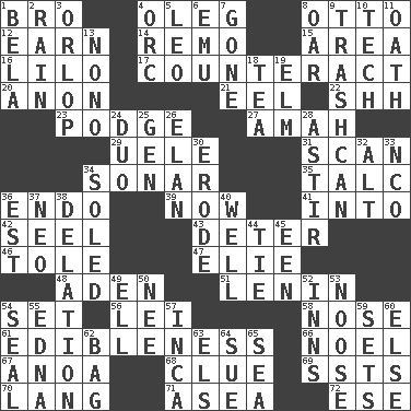 ACROSS 1. Sis' sibling 4. Cassini of fashion 8. Von Bismarck 12. Merit 14. San ____ (Riviera town) 15. Length times width 16. _ and Stitch 17. Act in opposition 20. At once, immediately (arch.) 21. Snakelike fish 22. Quiet! 23. Porridge 27. Nursemaid 29. Ubangi River tributary 31. Skim 34. Echolocation 35. Baby powder 36. Inside; within (prefix) 39. Immediately 41. To the inside or interior of 42. Stitch closed the eyes of (a falcon) 43. Prevent from occurring 46. Lacquered or enameled metalware 47. Writer Wiesel 48. An important port of Yemen 51. Soviet premier 1918-24 54. Put into a specified state 56. Flowery wreath 58. Sense of smell 61. The property of being fit to eat 66. Christmas carol 67. Small Philippine buffalo 68. A slight indication 69. Fast planes 70. Austrian-born American filmmaker Fritz 71. Toward the sea 72. Compass dir. DOWN 1. Actor Lugosi 2. Precipitation 3. Fourth or lowest deck 4. The grampus (Milton) 5. Lion 6. Australian flightless bird 7. Went 8. Rowing implement 9. File 13 10. Technology 11. Pledge 13. Words to Nanette 18. Afternoon social gathering 19. Shade tree 24. Superhero pair 25. Commissioned military rank (abbr.) 26. Liveliness 28. Moving or stirring 30. Eat (away) 32. The first octave above the treble staff 33. Non-commissioned officer (abbr.) 34. Having a sole or soles 36. Eastern Standard Time (abbr.) 37. Modern: prefix 38. Accusation by an informer 40. Not ill 44. Neckwear 45. Car or cant ending 49. Pipe bend 50. Born 52. Lodging establishments 53. Trap for birds or small mammals 54. Lick closed 55. Pulitzer Prize-winning author Ferber 57. South American Indian 59. Puts into a specified state 60. Otherwise 62. Container for groceries 63. Raised railways 64. Institute legal proceedings 65. Ocean
