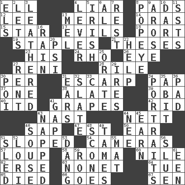 ACROSS 1. Pipe bend 4. One who doesn't tell the truth 8. Writing tablets 12. Area sheltered from the wind 13. Haggard of country music 14. Mouths or openings 15. Play the lead 17. Vices 18. Left side of a ship or aircraft 19. Paper fasteners 21. College papers 23. Part of HMS, perhaps 24. 17th letter of the Greek alphabet 26. Sight organ 27. Painter Guido (1575-1642) 28. Cause heat under the collar 30. For each 31. Fortification 34. Infant food 37. Single 38. Having winglike extensions 39. Chief or king in Benin or Nigeria 40. It would 41. Wine fruits 42. To free from 43. Political cartoonist Thomas 44. Remaining after all deductions 46. Plant excrement 47. Eastern Standard Time (abbr.) 50. Ewer handle 51. Inclined 54. Devices for capturing images 57. Central Nebraska county 58. Scent 60. The longest river in the world 62. Celtic language 63. Music written for nine 64. Third day of the wk. 65. Passed on 66. Travels 67. Elected rep. DOWN 1. Raised railways 2. Allows 3. Tough but pliablecoriaceous 4. Crowbar 5. From or relating to Ireland 6. Everything 7. Relief 8. Wimpy's pal 9. Came up 10. Have the gumption 11. Fast planes 13. Cartoonist voice _ Blanc 16. Precipitation 20. 23rd letter of the Greek alphabet 22. Assist 25. Speak pompously 27. Monthly bill 29. Angers 30. Luau course 31. Hearing organs 32. Chalkboard 33. Head covering 34. Likenesses of persons 35. "This won't hurt ____!" 36. Groovy apt. 41. Yawn 43. Slept 44. Born 45. Merit 46. Boozer 48. Biscuitlike quick bread 49. Makes less strong or intense 51. Downhill vehicle 52. Australian parrot (variant) 53. Mild oath, euphamism for damn 55. Floor protector 56. Change direction abruptly 59. Friend of Pooh 61. Car or cant ending