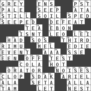 ACROSS 1. Jennifer or Joel 5. Followers of ems 8. Pacific Standard Time (abbr.) 11. Light colored 12. Ooze 14. _ moment's notice (2 wds.) 15. Not moving 17. Earth 18. Drove too fast 19. Oozed 21. Outscore 23. Afternoon social gathering 25. Inky black, to poets 26. Is not 27. Lion 28. Luau accessory 31. Possessed 33. Distress signal 35. One of three equal parts 37. Tall New Zealand timber tree 38. Cartoonist voice _ Blanc 40. Singer Brickell 41. Happening 43. Auto club (abbr.) 45. Compass dir. 46. Car or cant ending 47. No longer planned or scheduled 50. Trial 52. Root beer relative 53. Being at a high temperature 54. Speaker 56. Annoying sounds 61. Hoof sound 62. Neighbor of Neb. 65. Satellite of Uranus 66. Wing 67. Stalk of a moss capsule 68. Silent film actress Nazimova 69. Scottish cap 70. Allow 71. A home for chicks DOWN 1. Global Positioning Systems (abbr.) 2. Assign a rank or rating to 3. Writer Wiesel 4. Sharp bark 5. Double-curved letter 6. Modern: prefix 7. A glass for beer 8. Dad 9. Proofreading order 10. Small amount or degree 13. Cadet 16. Allows 18. Elected rep. 20. Lairs 22. 12 inches 24. Tiny particle 26. Goddess of spring and wife of Bragi 28. Hats (slang) 29. 4th largest of the Great Lakes 30. Binary compound 31. Hub of activity 32. So be it 34. Ocean 36. Behest 37. Portuguese money of account (variant) 39. Thin strip of wood or metal 42. A blast of a horn 44. Age 48. Soft thread for cleaning between teeth 49. Bundle 51. Portico 52. Head covering 54. Water jar 55. Wander aimlessly 57. SW Asia republic 58. Drop; flow; fall 59. Snakelike fish 60. Narrow board 61. Domesticated feline 63. Had dinner 64. Krazy ___ of comics