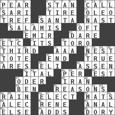 ACROSS 1. Lightbulb-shaped fruit 5. Comedian Laurel of Laurel & Hardy 9. Give a ring to 13. Indian skirt 14. Become fatigued 15. Margarine 16. Not kosher 17. Before Barbara or Clara 18. Political cartoonist Thomas 19. Deli grouping 21. Often (poetically) 22. Independent ruler or chieftain 23. Have the gumption 24. And so on (abbr.) 27. ___ a Wonderful Life 28. "Corrida" creature 29. One of three equal parts 31. American Automobile Association (abbr.) 32. Egg locale 36. Lug 37. Conclusion 38. Loyal 39. Ancient Greek god of war 40. Connecticut Ivy Leaguer 41. NE Netherlands city 42. Slanted text style (abbr.) 44. For each 46. Eastern Standard Time (abbr.) 47. River in Europe 48. SW Asia republic 50. Benjamin's nick name 51. Thinks logically 54. Precipitation 56. Choose 58. Floor protectors 60. Actor Baldwin 61. French philosopher Descartes 62. Of or related to the anus 63. Otherwise 64. Does sums 65. Dinghy DOWN 1. Pacific Standard Time (abbr.) 2. Hearing organs 3. Type of rug 4. Firearm 5. Flight of steps 6. Metal containers 7. Nonscientific branch of learning 8. Teachers' org. 9. Meets 10. Having winglike extensions 11. French article 12. Car dealer's back yard 17. Stricken, poetically 20. Among 21. Rowing implement 23. ___ good deed 24. Singer James 25. Son of Odin 26. Quote 28. Small boy 30. Home 31. Black tropical American cuckoo 33. Celtic language 34. Institutes legal proceedings 35. Portable shelter 37. Pipe bend 40. Ewer handle 41. Caspian sea tributary 43. "___ Little Indians" 44. Parts 45. Part of Q.E.F. 47. Off-Broadway awards 49. Roamer 51. Tear apart 52. Billionth: prefix 53. Play the lead 54. Actress Charlotte 55. Everything 56. Epoch 57. Directed 59. Insidious