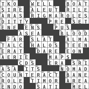 ACROSS 1. Ring climax 4. Water source 8. Water vessel 12. Title for a man of rank and authority 14. Eskimo relative 16. Cause heat under the collar 17. Ancient river in northeast Turkey 18. Complicated, petty procedures 20. Short, simple song 22. Before (prefix) 23. Put into a specified state 24. Compass dir. 25. Followers of ems 28. Tenth month of the Hindu calendar 30. Toward the sea 31. Vital fluid 35. At a great distance 37. Narrow board 40. _ mater 41. Baby powder 42. Radiant circles of light 44. Adolescent 45. Part of Q.E.F. 46. Have the gumption 47. Age 48. Nest on high 50. Atlas contents 52. Music discs 54. Epoch 55. Indian title of respect (Mr.) 58. White ___ sheet 61. It is 63. Roamer 65. Act in opposition 70. Object of repulsion 71. Hero or heavy, e.g. 72. The easternmost of the Lesser Sundas 73. Type of rug 74. Inside; within (prefix) 75. Suttee (variant) 76. Cartoonist voice _ Blanc DOWN 1. Sadhe (variant) 2. Japanese brewing company 3. Declaim 4. Armed conflict 5. Connecticut Ivy Leaguer 6. Part of a journey 7. Mass 8. Sis' sibling 9. Lubricates 10. Toward shelter 11. Trial 13. Eastern Standard Time (abbr.) 15. Canvas cover 19. Reuben's nickname 21. Affirmative reply 26. Soft 27. First course 29. Chalkboards 30. Northern region 32. Margarine 33. Sign of things to come 34. One of the 12 tribes of Israel 35. Conductor's collection 36. Having or resembling wings 38. According to 39. Singer Mel 41. Beverage made from leaves 43. Wither 49. Prepare for publication 51. Baking dish 53. Proofreading order 55. Excessive but superficial compliments 56. The wife of a rajah (variant) 57. Standard of perfection 58. Land measure 59. Within a short period 60. Old (Scot.) 62. Indian titles of respect 64. Chief or king in Benin or Nigeria 66. Modern: prefix 67. Wet nurse (var.) 68. Small bed 69. Three (prefix)