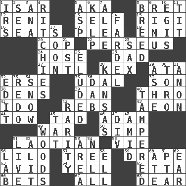 ACROSS 1. Austrian river, tributary to the Danube 5. Alias (abbr.) 8. Cy Young winner Saberhagen 12. Painter Guido (1575-1642) 13. Itself 15. Swiss mountan, "Queen of the Mountains" 16. Theater features 18. Entreaty 19. Send forth 20. Police officer (slang) 22. Son of Zeus who helped slay Medusa 24. Flexible conduit 26. Male parent 27. International (abbr.) 28. A weed 29. _ moment's notice (2 wds.) 32. Celtic language 35. Allodial 37. Manchild 38. Hiding places for outlaws 39. One of the 12 tribes of Israel 40. Through, poetically 41. Wedding promise 42. Confederate soldiers (slang) 43. A really long time 44. Pull behind 45. Small boy 46. First man 49. Armed conflict 50. Simple or foolish person 51. Of or relating to Laos or its people 55. Compete 56. _ and Stitch 57. Woody plant 59. Window treatment 63. Enthusiastic 64. Shout 65. Singer James 66. Stakes 67. 100% 68. Letter starter DOWN 1. Big collection agency 2. Observe 3. Santa ___, CA 4. Actors Guy, Robert Welles, and Clint 5. Viper 6. Seaweed 7. Toward shelter 8. A special lineage 9. Tall New Zealand timber tree 10. The front part of a cuirass 11. Teat (slang) 14. Bundle 17. Within a short period 21. Pacific Standard Time (abbr.) 23. Saxophone 25. Evaded 28. Sunflower state 29. American tennis player Robert 30. "Corrida" creature 31. Soon (poet.) 32. Prepare for publication 33. Do over again 34. Overwhelm 36. Apply (a substance) by light strokes 40. ________ with (broke a safety seal) 42. Noteworthy scarcity 45. Make lace 47. HTML Container Element 48. Among 49. Forest 51. Not recorded 52. Came down and settled, as after flight 53. Length times width 54. 1994 drama film starring Jodie Foster 56. Experiment locale 58. Pipe bend 60. Had dinner 61. Parent Teacher Assoc. 62. Ewer handle