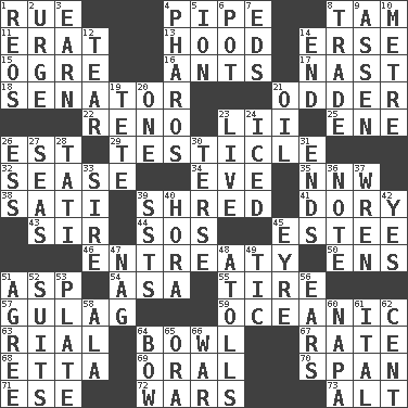 ACROSS 1. Regret 4. Corncob 8. Scottish cap 11. Part of Q.E.F. 13. Parka part 14. Celtic language 15. Legendary monster 16. Pismires 17. Political cartoonist Thomas 18. Legislator 21. More peculiar 22. Western Nevada city 23. Cards in a Roman deck? 25. Compass dir. 26. Eastern Standard Time (abbr.) 29. One of the two male reproductive glands 32. Gospel singer Marvin 34. Night before a holiday 35. Compass dir. 38. Suttee (variant) 39. Fragment 41. Small, narrow, flatbottom fishing boat 43. Title for a knight 44. Distress signal 45. First name in cosmetics 46. Plea 50. Followers of ems 51. Viper 54. White ___ sheet 55. Hoop that covers a wheel 57. Russian prison camp 59. Pertaining to the sea 63. Monetary unit of Yemen 64. Soup holder 67. Assign a rank or rating to 68. Singer James 69. Taken by mouth 70. Connect, as a bridge 71. Compass dir. 72. Armed conflicts 73. Keyboard modifier key DOWN 1. Vintage cars 2. Goad 3. Merit 4. N Egypt peninsula 5. Electrically charged atom 6. Cooking vessel 7. Begley and Asner 8. Swap 9. NE Netherlands city 10. Distance measurement (Brit.) 12. Pull apart 14. Conclude 19. Wig 20. Single 21. Petroleum 23. Moving, as bait 24. On the rocks 26. Curvy letter 27. Oceans 28. Jacques of French films 30. Laconic 31. Extremities 33. Father 36. Observe 37. Songbird 39. Fast planes 40. Israeli folk dance 42. Consenting reply 45. Jane of fiction 47. Tired old horse 48. Ringlike coral islands and reefs 49. Nervous spasm 51. Match 52. Sets of matching outer garments 53. Food holder 56. Hearing organs 58. Wing 60. California wine valley 61. Slanted text style (abbr.) 62. Penny 64. Ribbon knot 65. Mouth or opening 66. Armed conflict