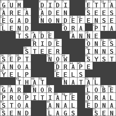 ACROSS 1. Chewing product 4. "You Light Up My Life" star Conn 8. Singer James 12. Length times width 14. Arabian gulf 15. Observes 16. Mild oath 17. Unrelated to defense, as in spending 20. Grant temporary use of 21. Mouth or opening 22. Parent Teacher Association (abbr.) 23. Sadhe (variant) 27. Singer Murray 29. Travel on or in a vehicle 31. Washington bills 34. Guide 35. Restaurants 36. Back-to-school mo. 39. At this time 41. System (abbr.) 42. Small Philippine buffalo 43. Window treatment 46. Sharp bark 47. Snakelike fish 48. Not this but _ 51. Brizilian seaport 54. Slender fish 56. Or not 58. Ear part 61. Appease 66. Of the mouth 67. Portico 68. Of or related to the anus 69. Pulitzer Prize-winning author Ferber 70. Post 71. Straggles 72. Elected rep. DOWN 1. Highlander 2. Goad 3. Intended 4. Daniel's nick name 5. Wedding promise 6. Lair 7. _ china 8. Compass dir. 9. 3-inch nail 10. Trial 11. Toward the sea 13. Does sums 18. Period 19. Avid follower 24. Tate display 25. Expire 26. Locale of original sin 28. Annoying sound 30. Eat (away) 32. Followers of ems 33. Fast jet (abbr.) 34. Staphylococcus 36. Declare 37. Compass dir. 38. Characterized by complete cowardliness 40. Songbird 44. Chicken ___ king 45. Pacific Standard Time (abbr.) 49. Cuckoo 50. Small child 52. Medicinal plant 53. Domineers 54. Global Positioning Systems (abbr.) 55. Johnson of "Laugh-In" 57. Monetary unit of Yemen 59. Object of repulsion 60. Style 62. Groovy apt. 63. Santa ___, CA 64. Label 65. Raised railways