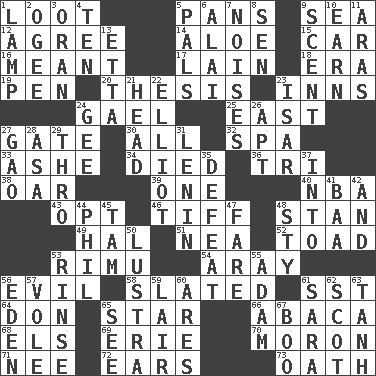 ACROSS 1. Plunder 5. Zero-star reviews 9. Ocean 12. Match 14. _ vera 15. 4-wheeled motor vehicle 16. Intended 17. (Had) reclined 18. Period 19. Animal enclosure 20. College paper 23. Lodging establishments 24. Highlander 25. Compass direction 27. Yard entry 30. Everything 32. Health resort 33. American tennis player Robert 34. Passed on 36. Three (prefix) 38. Rowing implement 39. Single 40. Basketball assoc. 43. Choose 46. Small quarrel 48. Comedian Laurel of Laurel & Hardy 49. Actor Linden 51. Teachers' org. 52. Frog relative 53. Tall New Zealand timber tree 54. Like ___ of sunshine 56. Morally bad or wrong 58. Scheduled 61. Fast jet (abbr.) 64. Spanish title 65. Play the lead 66. Phillipine bananalike plant 68. Raised railways 69. 4th largest of the Great Lakes 70. Person of subnormal intelligence 71. Born 72. Hearing organs 73. Pledge DOWN 1. Desk light 2. Double curve, resembling the letter S 3. NW Algerian seaport 4. Nine, plus one 5. Friends 6. Jai ____ 7. Annoying sounds 8. Elected rep. 9. Odor 10. Merit 11. Caspian sea tributary 13. Singer James 21. Froth on beer 22. American author Paul (1891-1958) 23. Austrian river, tributary to the Danube 24. Turn to the right 26. Fitting 27. E Mali city 28. White ___ sheet 29. Through, poetically 31. Soviet premier 1918-24 35. Outscore 37. To the inside or interior of 41. Sound made by sheep 42. Plus 44. Silvers or Donahue 45. Scottish cap 47. Conductor's collection 48. Filthy place 50. A period of five years 53. Wash lightly 55. First man 56. Locale of original sin 57. Short-tailed, large-bodied rat 59. Den 60. Ancient Greek god of war 61. "Two Mules for Sister ____" 62. Highlander 63. Hyperbolic tangent 65. Observe 67. Sometimes accompanies a hiss