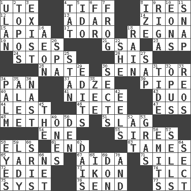 ACROSS 1. Shoshoni 4. Small quarrel 8. Angers 12. Brine-cured salmon 13. The sixth month of the Jewish calendar 14. The Jewish people; Israel 15. Capital of Western Samoa 17. "Corrida" creature 18. Rain (Swedish) 19. Olfactory organs 21. Girls' org. (abbr.) 23. Viper 24. Closes up, plugs up 26. Part of HMS, perhaps 28. Nathan's nickname 30. Legislator 34. Baking dish 37. Axlike tool, used for shaping wood 39. Corncob 40. Chicken ___ king 41. Sibling's daughter 43. Superhero pair 44. For fear that 46. Wig 47. Double-curved letter 48. Modes 51. Volcanic refuse 54. Compass dir. 55. Founders of families 58. Raised railways 61. Conclusion 63. Corrects by punishment or discipline 65. Entertaining tales 67. Opera by Verdi 71. Drop; flow; fall 72. Singer Brickell 73. Visual representation of an object 74. Affectionate concern, for short 75. System (abbr.) 76. Post 77. Fast jet (abbr.) DOWN 1. Uhlan (variant) 2. Traditional theme or motif 3. Have an existence 4. Make lace 5. Wedding promise 6. At a great distance 7. Toadlike animal 8. Ending with capital 9. Capital of Latvia 10. Immeasurably long periods of time 11. Fastener 16. Age 18. Water falling in drops from the sky 20. Health resort 22. A female animal or person 25. Comedian Laurel of Laurel & Hardy 27. Plant excrement 29. Prepares for publication 30. Religious groups 31. Periodic rise and fall of the sea level 32. Musical composition 33. Vintage cars 34. Inside of hand 35. Toward shelter 36. Political cartoonist Thomas 38. Last letter of the English alphabet 42. Snakelike fish 45. Definite Article 49. Washington bills 50. Lair 52. Small island 53. Pate de foie ____ 56. Gives off 57. Exchanges for money 58. Snake ____ (dice throw) 59. Kenny Rogers chart-topper in '80 60. Indian titles of respect 62. Raised platform 64. Religious group 66. Fish or hair follower 68. D.D.E's nickname 69. Spanish title 70. Also
