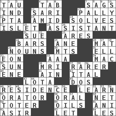 ACROSS 1. The 19th letter of the Greek alphabet 4. Bar bill 7. Sinks 11. Working for oneself (abbr.) 12. Indian skirt 13. Chummy 14. Parent Teacher Association (abbr.) 15. Among 16. Finds the solution 17. Small island 19. Helper 21. Institute legal proceedings 23. Ancient Greek god of war 24. Drinking establishments 25. One (Scot) 26. Floor protector 29. Parts of speech 30. Mountains (abbr.) 31. Pipe bend 32. Age 33. Auto club (abbr.) 34. Big _ 35. Player for Phoenix 36. Medical imaging device (abbr.) 37. More valued for its uncommonness 40. Compass dir. 41. The 18th letter of the Arabic alphabet 42. Slanted text style (abbr.) 43. Globular water bottle used in Asia 45. Two (Sp.) 46. Home 51. Acquire or gain knowledge or skills 55. Speaker 56. Taken by mouth 58. Fish or hair follower 59. Carrier 60. Petroleums 61. Black tropical American cuckoo 62. SW Saudi Arabia district 63. Allow 64. French article DOWN 1. Native american tent (variation) 2. Pismires 3. Allodial 4. Scottish cap 5. Roberta Peters solo 6. Auction offers 7. Table seasonings 8. Inventor's middle name 9. Small, secluded valley 10. System (abbr.) 12. Titan orbits this 13. Introduce or present, as a question 16. Founders of families 18. Son of Isaac 20. Before Barbara or Clara 22. Double-curved letter 24. Child's nurse 25. At full speed 26. Klaipeda city 27. Having or resembling wings 28. Affectionate concern, for short 29. Part of speech 32. Compass dir. 33. Believer in; advocate of (suffix) 36. Mother 37. To free from 38. Ringlike coral islands and reefs 39. Raze (variant) 43. 61 cubic inches 44. Aroma 46. Round or rotation of duties 47. Greek god of love 48. Suttee (variant) 49. Calm and collected 50. One of the Great Lakes 52. Of or related to the anus 53. French philosopher Descartes 54. Nuclear Threat Initiatives 57. The first octave above the treble staff