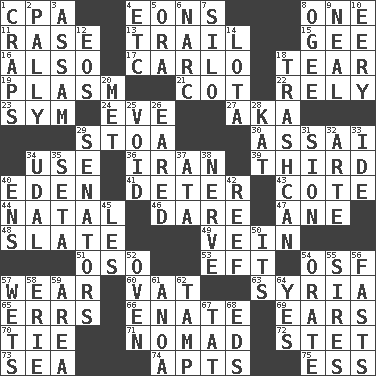 ACROSS 1. Numbers guy (abbr.) 4. Immeasurably long periods of time 8. Single 11. To erase 13. Drop behind 15. Unit of force equal to gravity 16. In addition 17. Monte _, Las Vegas Hotel/Casino 18. Rend 19. Suffix with ecto or cyto 21. Small bed 22. Have confidence or faith in 23. Symbol (abbr.) 24. First lady 27. Alias (abbr.) 29. Portico 30. Slender Brazilian palm 34. Purpose 36. SW Asia republic 39. One of three equal parts 40. Paradise 41. Prevent from occurring 43. ____ d'Azur (French Riviera) 44. Relating to or accompanying birth 46. Have the gumption 47. A saturated hydrocarbon 48. Chalkboard 49. Distinctive style or manner 51. Bear (Spanish) 53. Lizard (obsolete) 54. Order of Saint Francis (abbr.) 57. Put on (as clothing) 60. Large container 63. Damascus' land 65. Blunders 66. Related on the mother's side 69. Hearing organs 70. Standoff 71. Wanderer 72. Proofreading order 73. Ocean 74. Flats, for short 75. Curvy letter DOWN 1. Dice game 2. Chummy 3. Indian state 4. And so on (abbr.) 5. Mouth or opening 6. Drug cop 7. Grain storage tower 8. Double curve, resembling the letter S 9. Be tempered by heat 10. Suggestive of the supernatural 12. Greek goddess of the dawn 14. Globular water bottle used in Asia 18. File 13 20. Was introduced to 25. State of nonexistence 26. Having ears or earlike features 28. Krazy ___ of comics 29. Legislators 31. The Jewish people; Israel 32. Johnson of "Laugh-In" 33. Binary compound 34. Hereditary estate 35. Stalk of a moss capsule 37. "One Day ___ Time" 38. Boldness 40. Followers of ems 42. Coral ridge 45. French article 50. ___ a Wonderful Life 52. Baking chamber 54. Speak pompously 55. Titles for men of rank and authority 56. Goes without food and/or water 57. Moistens 58. 4th largest of the Great Lakes 59. Type of rug 61. Small Philippine buffalo 62. Pack (down) 64. Consenting reply 67. Make lace 68. Begley and Asner