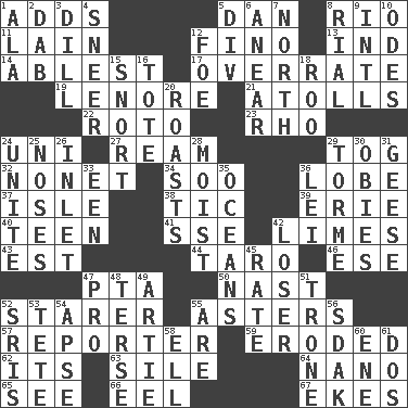 ACROSS 1. Sums up 5. Daniel's nick name 8. _ de Janeiro 11. (Had) reclined 12. A pale, very dry sherry 13. Indiana (abbr.) 14. Most capable 17. Make much ado about nothing 19. Poe poem 21. Ringlike coral islands and reefs 22. Printing process, for short 23. 17th letter of the Greek alphabet 24. University (slang) 27. 480, 500 or 516 sheets of paper 29. Coat; cloak 32. Music written for nine 34. "Barney Miller" actor Jack 36. Ear part 37. Capri or Wright 38. Nervous spasm 39. 4th largest of the Great Lakes 40. Adolescent 41. Compass dir. 42. Citrus fruits 43. Eastern Standard Time (abbr.) 44. Pacific island yam 46. Compass dir. 47. Parent Teacher Association (abbr.) 50. Political cartoonist Thomas 52. A viewer who gazes fixedly 55. Michaelmas daisies 57. Newsperson 59. Eaten away 62. ___ a Wonderful Life 63. Drop; flow; fall 64. Billionth: prefix 65. Perceive with the eye 66. Snakelike fish 67. Makes supply last DOWN 1. According to 2. Small moist lump or mass 3. Deli pickle 4. Contemptuous expression 5. HTML Container Element 6. Approach 7. Compass direction 8. Monetary unit of Yemen 9. International (abbr.) 10. Lyric poems 12. Enemy 15. Derisive sound 16. Carryall 18. Friend of Pooh 20. Ridicules or criticizes harshly 24. Join together 25. Olfactory organs 26. An arm off of a larger body of water 28. Damp 29. Singer Mel 30. Off-Broadway awards 31. Honkers 33. Car or cant ending 35. Seas 36. Luau accessory 42. Failure 45. Assign a rank or rating to 47. Adept person 48. Laconic 49. Nick name for Arthur 51. Heavy duty weighing machine 52. Indian titles of respect 53. False hair 54. Domed church section 55. "We ___ not amused" (Victoria) 56. Neighbor of Neb. 58. Pipe bend 60. Compass dir. 61. Two (Sp.)