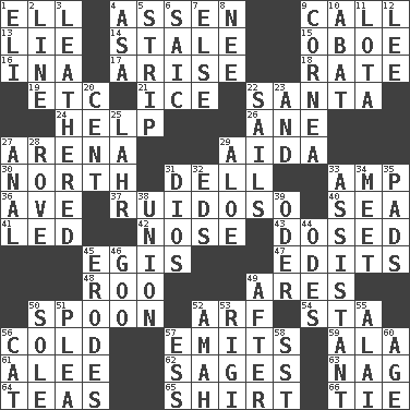 ACROSS 1. Pipe bend 4. NE Netherlands city 9. Give a ring to 13. Untruth 14. Showing deterioration from age 15. Mitch Miller's instrument 16. _ tizzy (2 wds.) 17. Originate 18. Pace 19. And so on (abbr.) 21. Frozen water 22. Before Barbara or Clara 24. Assist 26. A saturated hydrocarbon 27. Sports stadium 29. Opera by Verdi 30. _ pole 31. Small valley 33. Electrical Unit 36. "___ Maria" 37. Noisy, rowdy, vocal (Spanish) 40. Ocean 41. Directed 42. Characteristic smell of wine 43. Administered medicine 45. Armor plate that protects the chest 47. Prepares for publication 48. Friend of Pooh 49. Ancient Greek god of war 50. Soup utensil 52. Sandy's bark 54. R.R. building 56. Having a low temperature 57. Sends forth 59. Insect wing 61. Toward shelter 62. Gurus 63. Tired old horse 64. Beverages made from leaves 65. Upper-body garment 66. Neckwear DOWN 1. Connecticut Ivy Leaguer 2. Actor's bit 3. Tough but pliablecoriaceous 4. White ___ sheet 5. Remove all contents or possession from 6. Ketch in the Levant 7. Otherwise 8. Born 9. Pupil covering 10. Blind as ____ 11. Globular water bottle used in Asia 12. Area sheltered from the wind 20. Penny 22. Moves on water 23. Plus 25. Cowardly lion portrayer 27. Of or related to the anus 28. Be footloose 29. Medicinal plant 31. "Vaya con ____" 32. Begley and Asner 33. Helper 34. Confront 35. Writing tablets 38. The state of being joined or united 39. Baltic tributary 44. Lyric poems 45. Eats (away) 46. Thick or sticky substance 49. Following 50. Not divided or shared with others 51. Entreaty 52. Nanny 53. Swiss mountan, "Queen of the Mountains" 55. Jai ____ 56. Feline 57. Curvy letter 58. Fast jet (abbr.) 60. Grow older