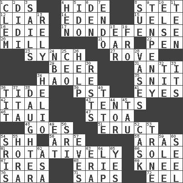 ACROSS 1. Music discs 4. Flintstone garb 8. Proofreading order 12. One who doesn't tell the truth 14. Locale of original sin 15. Ubangi River tributary 16. Singer Brickell 17. Unrelated to defense, as in spending 20. Place where flour is made 21. Rowing implement 22. Writing instrument 23. Synchronize (abbr.) 27. Be footloose 29. Fermented drink made from hops 31. Against 34. White Person, in Hawaii 35. In a ____ (agitated or irritated) 36. Periodic rise and fall of the sea level 39. Pacific Standard Time (abbr.) 41. Snake ____ (dice throw) 42. Slanted text style (abbr.) 43. Portable shelters 46. "Change" in Tahitian 47. Portico 48. Travels 51. Spew [out] 54. Quiet! 56. "We ___ not amused" (Victoria) 58. Ancient river in northeast Turkey 61. Rotating or pertaining to rotation 66. Flatfish 67. Angers 68. 4th largest of the Great Lakes 69. Leg joint 70. "Two Mules for Sister ____" 71. Plant excrements 72. Snakelike fish DOWN 1. Clement's nick name 2. "You Light Up My Life" star Conn 3. Moves on water 4. Layer 5. Wedding promise 6. Lair 7. Inside; within (prefix) 8. Institute legal proceedings 9. 3-inch nail 10. Otherwise 11. Adolescent 13. Have trust in 18. Hearing organ 19. Back 24. Basketball assoc. 25. Corporate head (abbr.) 26. Aid 28. Flower holders 30. Musical pauses 32. Standoff 33. It is 34. Sun: prefix 36. Teat (slang) 37. Call ___ day 38. Female offspring 40. Wig 44. Not either 45. The 19th letter of the Greek alphabet 49. Ingest 50. Indian title of respect (Mr.) 52. Keg 53. Marketplace scale 54. Indian titles of respect 55. Israeli folk dance 57. Nights before holidays 59. Toward shelter 60. Sew up the eyelids of hawks and falcons 62. White ___ sheet 63. Period 64. Mouth edge 65. Consenting reply