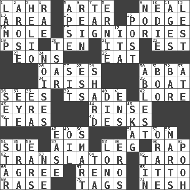 ACROSS 1. Cowardly lion portrayer 5. Johnson of "Laugh-In" 9. Anneal 13. Length times width 14. Lightbulb-shaped fruit 15. Plash 16. Undercover agent 17. Seigniories (variant) 19. Air pressure measure (abbr.) 20. Nine, plus one 21. ___ a Wonderful Life 22. Eastern Standard Time (abbr.) 23. Immeasurably long periods of time 25. Consume 26. Fertile tracts in a desert 30. Swedish rock group 34. From or relating to Ireland 35. Water vessel 36. Perceives with the eye 39. Sadhe (variant) 42. Old wives' tales, e.g. 43. Jane of fiction 44. Wash lightly 46. Beverages made from leaves 47. Writing tables 48. Greek goddess of the dawn 51. Smallest unit of an element 54. Institute legal proceedings 57. Direct toward a target or goal 58. Part of a journey 60. Hit sharply and swiftly 62. Interpreter 65. Pacific island yam 66. Match 67. Western Nevada city 68. "Tell ____ the Marines!" 69. To erase 70. Labels 71. Soft DOWN 1. Desk light 2. Came up 3. Sun: prefix 4. Actress Charlotte 5. Domed church section 6. It's straight from the horse's mouth 7. Label 8. Bert's buddy 9. And not 10. Singer Brickell 11. Ripens 12. For fear that 15. Mail 18. Call ___ day 20. Russian ruler of old 24. Annoying sounds 27. Be seated 28. Curvy letter 29. Broken piece 30. Most capable 31. Sometimes accompanies a hiss 32. Oblong piece of solid material 33. Had dinner 36. Put into a specified state 37. Sight organ 38. Epoch 40. Expire 41. Followers of ems 45. Heroin 48. Relaxation 49. Petroleum 50. Don Adams' spy role 52. Declaim 53. Shops 54. Play the lead 55. Capital and largest city of Mongolia 56. Hearing organs 58. Having great length 59. Greek god of love 61. "Silly old bear" 63. Born 64. Beverage made from leaves 65. Metal container