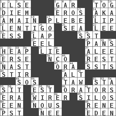 ACROSS 1. Otherwise 5. Slender fish 8. Coat; cloak 11. South Vietnam president (1954) 12. Greek god of love 14. Alias (abbr.) 15. At full speed 17. Military trainee 18. Mouth edge 19. Small, flat, pigmented spot on the skin 21. Ocean 22. Area sheltered from the wind 23. Double-curved letter 24. Pet locale 25. Fast jet (abbr.) 27. Snakelike fish 28. Baking dishes 31. Pile 35. Falsehood 37. Toward shelter 38. Celtic language 39. Non-commissioned officer (abbr.) 41. Relief 42. Political cartoonist Thomas 43. Mouth or opening 45. Fast planes 46. Agitate 47. The first octave above the treble staff 49. Distress signal 51. The 23rd letter of the Hebrew alphabet 52. R.R. building 55. Be seated 57. Eastern Standard Time (abbr.) 60. Speakers 62. Epoch 63. One who wires 65. Grain storage towers 66. Car or cant ending 67. Common sense 68. French philosopher Descartes 69. Pacific Standard Time (abbr.) 70. Born 71. Genesis locale DOWN 1. Peak District village in England 2. Citrus fruits 3. Actors Connery and Penn 4. Send forth 5. Set 6. Ancient Greek god of war 7. Loose flowing garment 8. Baron Munchausen's specialties 9. Migrant worker of the '30s 10. Yawn 13. Oceans 16. The longest river in the world 17. Cotton for raincoats, e.g. 20. Highlander 26. Practice fights 29. A home for chicks 30. Puts into a specified state 31. Coop moms 32. Part of Q.E.F. 33. Aide 34. Stone: prefix 36. Environmental prefix 40. Speaker 44. Having or resembling wings 48. It was, poetically 50. Stitched 52. Having a sole or soles 53. Heavy duty weighing machine 54. NE Netherlands city 55. Ooze 56. Angers 58. The Jewish people; Israel 59. Loyal 61. Hoop that covers a wheel 64. Compass dir.