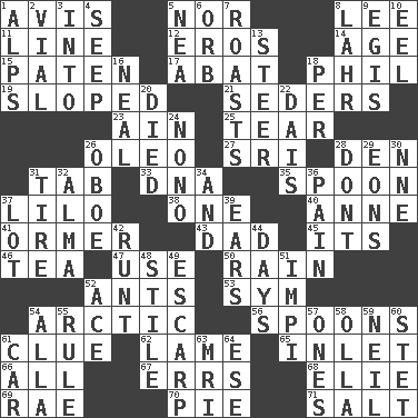 ACROSS 1. Deliberation 5. Not either 8. Area sheltered from the wind 11. Actor's bit 12. Greek god of love 14. Personal question 15. Eucharist need 17. Blind as ____ 18. Silvers or Donahue 19. Inclined 21. Spring feasts 23. The 18th letter of the Arabic alphabet 25. Separate forcefully 26. Butter sub 27. _ Lanka 28. Lair 31. Bar bill 33. Heredity factor (abbr.) 35. Soup utensil 37. _ and Stitch 38. Single 40. Singer Murray 41. Channel Islands abalone 43. Male parent 45. It is 46. Afternoon social gathering 47. Purpose 50. Water falling in drops from the sky 52. Pismires 53. Symbol (abbr.) 54. Northern region 56. Soup utensils 61. A slight indication 62. Unable to walk 65. An arm off of a larger body of water 66. Everything 67. Blunders 68. Writer Wiesel 69. Actress Charlotte 70. Sliced dessert 71. Table seasoning DOWN 1. High mountains 2. Small bottle 3. To the inside or interior of 4. Ooze 5. Teachers' org. 6. Globe 7. Exposes to great heat 8. Cowardly lion portrayer 9. Armor plate that protects the chest 10. Snakelike fish 13. Navigate 16. Be tempered by heat 18. For each 20. Passed on 22. Raised platform 24. Words to Nanette 26. Mitch Miller's instrument 28. Do not 29. Immeasurably long periods of time 30. Compass dir. 31. Hoop that covers a wheel 32. _ mater 34. Added to 36. Ache 37. Car dealer's back yard 39. Hearing organs 42. The smallest animal of a litter 44. 24-hour periods 48. Vertical member of a panel or frame 49. Fortification 51. Body of Kaffir warriors 52. Adept person 54. Silent film actress Nazimova 55. Court order 57. Washington bills 58. Spanish pot 59. Famous astronaut Armstrong 60. Proofreading order 61. 4-wheeled motor vehicle 63. Medical imaging device (abbr.) 64. Compass dir.