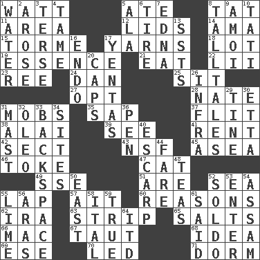 ACROSS 1. Electrical Unit 5. Had dinner 8. Make lace 11. Type of rug 12. Flaplike coverings 14. Wet nurse (var.) 15. Singer Mel 17. Tall tales 18. Car dealer's back yard 19. Substance 21. Ingest 22. Cards in a Roman deck? 23. To separate or throw off 24. One of the 12 tribes of Israel 25. Be seated 27. Elect 28. Nathan's nickname 31. Crowds into 35. Plant excrement 37. Secret move to avoid paying debts 38. Jai _ 39. Observe 41. Monthly bill 42. Religious group 43. Science/research agcy. 45. At sea 46. Casino tip 47. Feline 49. Compass dir. 51. "We ___ not amused" (Victoria) 52. Ocean 55. Infant locale 57. Small island 60. Thinks logically 62. Lyricist Gershwin 63. Long narrow piece of something 65. Table seasonings 66. Apple computer (short form) 67. Strained 68. The content of cognition 69. Compass dir. 70. Directed 71. Dormintory (informal) DOWN 1. Wetness 2. Came up 3. Laconic 4. Docile 5. Insect wing 6. Become fatigued 7. Pulitzer Prize-winning author Ferber 8. Baron Munchausen's specialties 9. Mine, in Marseilles 10. Jacques of French films 13. Fast planes 16. Inside; within (prefix) 17. Gossips 20. Smile enhancers 26. Kind of red light 29. Prong on a fork 30. Singer James 31. Vertical spar for supporting sails 32. Margarine 33. Keyboard key 34. Locates 36. Animal enclosure 40. Fortification 44. Conductor's collection 48. Afternoon social gatherings 50. 90 degrees 52. Twentieth part of a lira 53. Keyboard key 54. Indian state 55. Welles in "The Third Man" 56. Ancient river in northeast Turkey 58. Slanted text style (abbr.) 59. Loyal 61. Stated 64. It would