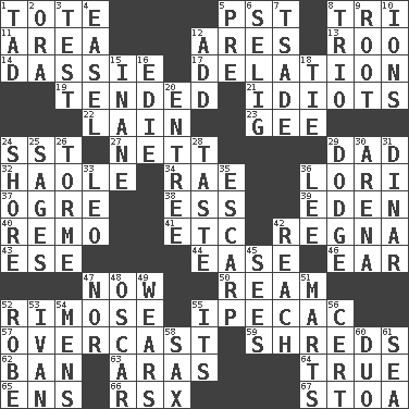 ACROSS 1. Lug 5. Pacific Standard Time (abbr.) 8. Three (prefix) 11. Length times width 12. Ancient Greek god of war 13. Friend of Pooh 14. Hyrax 17. Conveyance 19. Watched over 21. Foolish or stupid persons 22. (Had) reclined 23. Turn to the right 24. Fast jet (abbr.) 27. Remaining after all deductions 29. Male parent 32. White Person, in Hawaii 34. Actress Charlotte 36. Australian parrot (variant) 37. Legendary monster 38. Double-curved letter 39. Paradise 40. San ____ (Riviera town) 41. And so on (abbr.) 42. Rain (Swedish) 43. Compass dir. 44. Relaxation 46. Hearing organ 47. At this time 50. 480, 500 or 516 sheets of paper 52. Full of chinks, cracks, or crevices 55. Medicinal drug used to evoke vomiting 57. Cloudy 59. Fragments 62. Forbid 63. Caspian sea tributary 64. Loyal 65. Followers of ems 66. Acura sports coupe 67. Portico DOWN 1. Small boy 2. Mouth or opening 3. Trial 4. Artist's stand 5. Before (prefix) 6. Former Milwaukee Brewers owner Bud 7. Sadhe (variant) 8. Musical group of three 9. Carrot, for example 10. Charged particles 12. Increase 15. Lacking in sense or substance 16. Singer Brickell 18. Standoff 20. Main course 24. Dinah or Pauly 25. Gurus 26. Singer Mel 28. Clothes sense 29. Evade 30. Sports stadium 31. Middle Eastern gold or silver currency 33. Lion 35. Fortification 36. Area sheltered from the wind 42. Arrive at 45. Observes 47. Or not 48. Witty Wilde 49. Puts on (as clothing) 51. Shops 52. Loose flowing garment 53. _ the terrible 54. Not women's 55. ___ a Wonderful Life 56. An absolute certainty 58. Saxophone 60. Superhero pair 61. Ocean