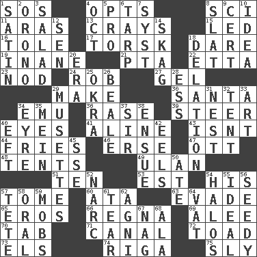 ACROSS 1. Mayday 4. Chooses 8. _-fi 11. Ancient river in northeast Turkey 13. Trading vessels 15. Directed 16. Lacquered or enameled metalware 17. Cod relative 18. Have the gumption 19. Empty; void 21. Parent Teacher Association (abbr.) 22. Singer James 23. Allow head to fall sleepily 24. Director Reiner 27. Set 29. Cause to be 30. Before Barbara or Clara 34. Australian flightless bird 36. Raze (variant) 39. Bull 40. Sight organs 41. Place in a line 43. Is not 44. Strips of potato fried in deep fat 46. Celtic language 47. Baseball player Mel 48. Portable shelters 49. Uhlan (variant) 51. Nine, plus one 53. Eastern Standard Time (abbr.) 54. Part of HMS, perhaps 57. Heavy book 60. _ moment's notice (2 wds.) 63. Elude 65. Greek god of love 66. Rain (Swedish) 69. Toward shelter 70. Keyboard key 71. Lessep's creation 72. Frog relative 73. Raised railways 74. Port city in Latvia 75. Playfully artful DOWN 1. Smooth fabric 2. U. of Maine site 3. First course 4. Sep. follower 5. Adept person 6. Canvas cover 7. System (abbr.) 8. Narrow board 9. Sure thing 10. The main thing one is thinking about 12. Elected rep. 14. Heroin 18. Accusation by an informer 20. Epoch 25. Gumbo ingredient 26. Memphis, Tenn. Street 28. Double-curved letter 29. French bagpipes 31. A home for chicks 32. Portable shelter 33. Tate display 34. Jane of fiction 35. Chow _ 37. Title for a knight 38. Take place subsequently 40. Lizard (obsolete) 42. Snakelike fish 45. Compass dir. 50. Had dinner 52. Drug cop 54. Saint headwear 55. Standard of perfection 56. Shabby and untidy 57. Wig 58. Of the mouth 59. Disorderly crowds 61. Lacerate 62. Hindu god of fire 64. Large container 67. Tired old horse 68. According to