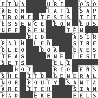 ACROSS 1. Inactive volcano in Sicily 5. RI univ. 8. Bear (Spanish) 11. Period of immesurable duration 12. Jacques of French films 14. Plant excrement 15. Heavy duty weighing machine 17. Trials 18. Teat (slang) 19. Substance 21. A really long time 22. Begley and Asner 23. Born 24. Commissioned military rank (abbr.) 25. "___ Little Indians" 27. To free from 28. SW Saudi Arabia district 31. Inside of hand 35. Directed 37. Beget 38. Butter sub 39. ___ good deed 41. Nights before holidays 42. Beverages made from leaves 43. Compass dir. 45. For fear that 46. Puts into a specified state 47. Connecticut Ivy Leaguer 49. Being at a high temperature 51. _ de Janeiro 52. Followers of ems 55. A female animal or person 57. It would 60. Commissioned military rank 62. Not either 63. Marked by pouting 65. Before Barbara or Clara 66. "We ___ not amused" (Victoria) 67. Hankering 68. Thailand, formerly 69. Groovy apt. 70. Supplement with great effort 71. Snakelike fish DOWN 1. Ingested 2. Laconic 3. Trap for birds or small mammals 4. Queen of England 1702-14 5. Shoshoni 6. To erase 7. "Tell ____ the Marines!" 8. Clearly or manifestly demonstrative 9. Stated 10. Chooses 13. Is not 16. Engineer (abbr.) 17. Looked after 20. To provide with a ceiling 26. Artist's stand 29. Angers 30. State of inaction 31. Plant holders 32. Toward shelter 33. Tough but pliablecoriaceous 34. With motion or animation 36. Spanish title 40. Disorder of the immune system 44. Writer Wiesel 48. Charged atoms 50. Native american tent (variation) 52. Bert's buddy 53. Brizilian seaport 54. Shuts with force 55. Fastener 56. Israeli folk dance 58. Carryall 59. Evade 61. Relaxation 64. Definite Article