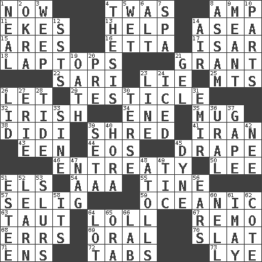 ACROSS 1. At this time 4. It was, poetically 8. Electrical Unit 11. Supplements with great effort 13. Assist 14. Toward the sea 15. Ancient Greek god of war 16. Singer James 17. Austrian river, tributary to the Danube 18. Portable computers 21. Let have 22. Indian skirt 23. Untruth 25. Mountains (abbr.) 26. Allow 29. One of the two male reproductive glands 32. From or relating to Ireland 34. Compass dir. 35. Java container 38. "You Light Up My Life" star Conn 39. Fragment 41. SW Asia republic 43. Car or cant ending 44. Greek goddess of the dawn 45. Window treatment 46. Plea 50. Area sheltered from the wind 51. Raised railways 54. American Automobile Association (abbr.) 55. Prong on a fork 57. Former Milwaukee Brewers owner Bud 59. Pertaining to the sea 63. Pulled tight 64. Hang loosely or laxly 67. San ____ (Riviera town) 68. Blunders 69. Taken by mouth 70. Narrow board 71. Followers of ems 72. Bar bills 73. Potassium hydroxide DOWN 1. Anneal 2. Gumbo ingredient 3. Shed a tear 4. College paper 5. Soggy 6. Keyboard modifier key 7. Health resort 8. Indian state 9. Intended 10. Actors' quests 12. Fast planes 14. Atmosphere 19. Pledge 20. Before (prefix) 21. Set 23. Actor's bit 24. On the rocks 26. Hat (slang) 27. One of the Great Lakes 28. Event that recurs at intervals 30. Laconic 31. Independent ruler or chieftain 33. Trig term 36. Mountain range 37. Open wide 39. Stalk of a moss capsule 40. Israeli folk dance 42. Born 45. Centimeter-gram-second unit of force 47. Tired old horse 48. Ringlike coral islands and reefs 49. Nervous spasm 51. First name in cosmetics 52. Memorize 53. Plays smoothly or legato 56. Hearing organs 58. ___ a Wonderful Life 60. 1994 drama film starring Jodie Foster 61. "If ____ say so..." 62. ____ d'Azur (French Riviera) 64. Car dealer's back yard 65. Mouth or opening 66. Experiment locale