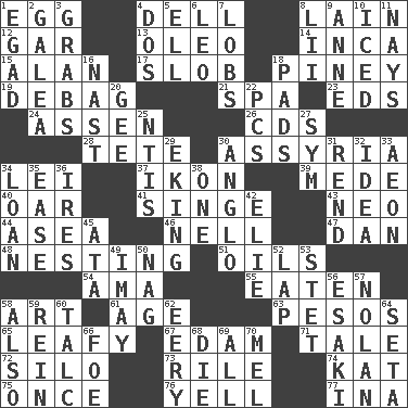 ACROSS 1. Oval reproductive body of a fowl 4. Small valley 8. (Had) reclined 12. Slender fish 13. Margarine 14. South American Indian 15. Actor Alda or Thicke 17. Messy guy 18. Abounding in pines 19. Debunk (Brit. slang) 21. Health resort 23. Begley and Asner 24. NE Netherlands city 26. Music discs 28. Wig 30. Nineveh was its capital 34. Luau accessory 37. Visual representation of an object 39. Ancient Persian 40. Boat paddle 41. Scorch 43. Modern: prefix 44. At sea 46. 1994 drama film starring Jodie Foster 47. One of the 12 tribes of Israel 48. Inhabiting a nest 51. Lubricates 54. Wet nurse (var.) 55. Consumed 58. Tate display 61. Personal question 63. Mexican monetary units 65. Like summer trees 67. Dutch treat 71. Story 72. Grain storage tower 73. Cause heat under the collar 74. Krazy ___ of comics 75. Single time 76. Shout 77. _ tizzy (2 wds.) DOWN 1. Mild oath 2. An organ shaped like a helmet 3. Takes hold of 4. Two (Sp.) 5. Pipe bend 6. Lion 7. Tennis shots 8. Cards in a Roman deck? 9. Queen of England 1702-14 10. On the rocks 11. Negative votes 16. Political cartoonist Thomas 18. Writing tablets 20. Unit of force equal to gravity 22. Personal Computers (abbr.) 25. Nuclear Threat Initiatives 27. Symbol (abbr.) 29. Supplementing with great effort 30. White American of non-Hispanic descent 31. Tear apart 32. The main thing one is thinking about 33. A really long time 34. Grant temporary use of 35. Relaxation 36. Angers 38. Single 42. Writer Wiesel 45. "One Day ___ Time" 49. "If ____ say so..." 50. Tired old horse 52. Infant locale 53. Proofreading order 56. 1973 Nobel Price Winner (Physics) Leo 57. Pitcher Ryan 58. In addition 59. It's straight from the horse's mouth 60. Baby powder 62. Suggestive of the supernatural 64. Bristle 66. Enemy 68. Expire 69. 100% 70. Cartoonist voice _ Blanc