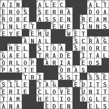 ACROSS 1. The 18th letter of the Arabic alphabet 4. Actor Baldwin 8. Keyboard modifier key 11. Greek god of love 13. Spanish missionary in California 15. ___ good deed 16. Loose flowing garment 17. NE Netherlands city 18. 480, 500 or 516 sheets of paper 19. An arm off of a larger body of water 21. She-sheep 22. Taverns 23. Sight organ 24. Australian flightless bird 27. Dripping 29. Of or related to the anus 30. Lean end of the neck 34. Cartoonist voice _ Blanc 36. Portico 39. Dinah or Pauly 40. Highlander 41. Buy and sell 43. Slanted text style (abbr.) 44. Lowest deck of a ship 46. Operatic vocal solo 47. Greek goddess of the dawn 48. Thick mixture 49. Mouths or openings 51. Three (prefix) 53. Fast jet (abbr.) 54. Compass dir. 57. Filth; sediment 60. Label 63. Prepares for publication 65. 4th largest of the Great Lakes 66. Garlic unit 69. A single undivided whole 70. Scottish cap 71. Sun: prefix 72. Stare 73. Santa ___, CA 74. Locale of original sin 75. Raised railways DOWN 1. Nest on high 2. Literary sarcasm 3. Having high moral qualities 4. White ___ sheet 5. French article 6. Celtic language 7. Ship's personnel 8. An important port of Yemen 9. Grant temporary use of 10. Scottish caps 12. Perceive with the eye 14. Afresh 18. Actors Guy, Robert Welles, and Clint 20. "___ Little Indians" 25. Vertical spar for supporting sails 26. Extreme 28. Double-curved letter 29. One to whom something is allotted 31. Printing process, for short 32. Ancient river in northeast Turkey 33. Set 34. Hindu Mythology: god of death 35. Snakelike fish 37. Boat paddle 38. Goodbye (Sp.) 40. Grand Old Party 42. Hearing organs 45. For each 50. Had dinner 52. Hankering 54. Burn superficially 55. Not moving 56. _____ Park, CO 57. Stalk of a moss capsule 58. SW Asia republic 59. Pale green bean 61. Toward shelter 62. Gilded 64. Superhero pair 67. Compete 68. Age