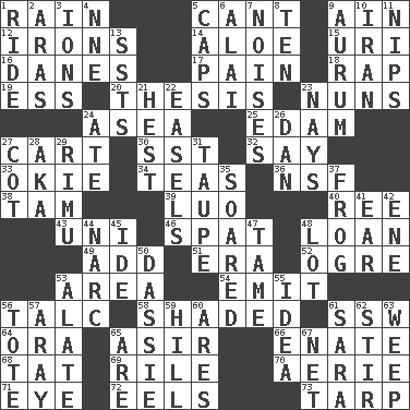 ACROSS 1. Precipitation 5. Patter 9. The 18th letter of the Arabic alphabet 12. Metal shackles 14. Medicinal plant 15. RI univ. 16. Natives or inhabitants of Denmark 17. Ache 18. Hit sharply and swiftly 19. Curvy letter 20. College paper 23. Religious women 24. Toward the sea 25. Dutch treat 27. Haul 30. Fast jet (abbr.) 32. Declare 33. Migrant worker of the '30s 34. Beverages made from leaves 36. Overdraft (abbr.) 38. Scottish cap 39. Nilotic language 40. To sift 43. University (slang) 46. Petty quarrel 48. Grant temporary use of 49. Say or write further 51. Period 52. Legendary monster 53. Length times width 54. Send forth 56. Baby powder 58. Cast a shadow over 61. Compass dir. 64. Mouth or opening 65. SW Saudi Arabia district 66. Related on the mother's side 68. Make lace 69. Cause heat under the collar 70. Nest on high 71. Sight organ 72. Snakelike fish 73. Canvas cover DOWN 1. Travel on or in a vehicle 2. Ancient river in northeast Turkey 3. Charged particles 4. Compass dir. 5. Balmoral and tarboosh 6. Jai ____ 7. Annoying sounds 8. "___ Little Indians" 9. Gold (Symbol: Au) 10. SW Asia republic 11. Pinches, bites 13. Fast planes 21. Command 22. Artist's stands 23. Negative votes 24. Had dinner 26. Daniel's nick name 27. Small bed 28. Alias (abbr.) 29. Tall New Zealand timber tree 31. Grayish beige 35. Flew 37. Tree-dwelling hopper 41. Hearing organ 42. Compass dir. 44. Drug cop 45. Binary compound 47. Not wild 48. Car dealer's back yard 50. Small ungulate mammals of Africa 53. Having winglike extensions 55. The main thing one is thinking about 56. Haul 57. Like ___ of sunshine 59. Land elevation 60. Ancient Greek god of war 61. "Two Mules for Sister ____" 62. Agitate 63. Shed a tear 65. "We ___ not amused" (Victoria) 67. Fish or hair follower