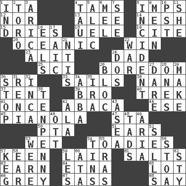 ACROSS 1. Call ___ day 4. Scottish caps 8. Naughty children 12. And not 13. Toward shelter 14. Tender 15. Frees from moisture 18. Ubangi River tributary 19. Quote 20. Pertaining to the sea 22. Acquire through effort 23. Set down 24. Male parent 25. _-fi 26. Mood resulting from idleness 30. _ Lanka 33. Moves on water 36. Grandmother 37. Portable shelter 39. Sis' sibling 40. Long journey 41. At one time in the past 42. Phillipine bananalike plant 44. Compass dir. 45. Player piano 47. R.R. building 50. Parent Teacher Association (abbr.) 51. Hearing organs 53. Dripping 54. Sycophants 57. Peachy ____! 59. Den 61. Table seasonings 63. Merit 64. Inactive volcano in Sicily 65. Car dealer's back yard 66. Jennifer or Joel 67. Backtalk 68. Declare DOWN 1. Working for oneself (abbr.) 2. "Corrida" creature 3. N. Chile seaport 4. "Change" in Tahitian 5. Actor Baldwin 6. Cartoonist voice _ Blanc 7. Perceive with the eye 8. Event 9. Chow _ 10. Pacific Standard Time (abbr.) 11. A female animal or person 16. Snakelike fish 17. Ketch in the Levant 21. Nuclear Threat Initiatives 22. Armed conflict 24. Two (Sp.) 26. Group of countries in special alliance 27. Have the gumption 28. Washington bills 29. Cause to be 30. Halt 31. Painter Guido (1575-1642) 32. South American Indian 34. Swedish rock group 35. Lyricist Gershwin 38. 3-inch nail 42. According to 43. Toward the sea 46. Baseball player Mel 48. Small amounts or degrees 49. Operatic vocal solo 52. Makes a sale 53. We are 54. Airtight sealed metal containers 55. Mouths or openings 56. Portico 57. Barrel 58. Ewer handle 59. French article 60. "One Day ___ Time" 62. Filthy place