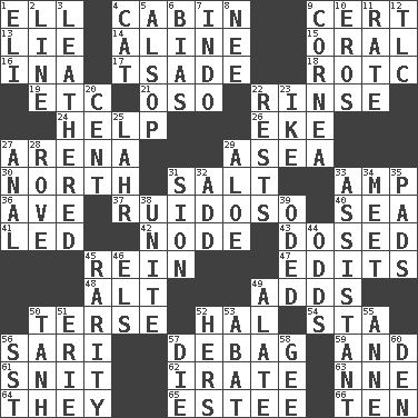 ACROSS 1. Pipe bend 4. Apartment or room in a ship 9. An absolute certainty 13. Untruth 14. Place in a line 15. Of the mouth 16. _ tizzy (2 wds.) 17. Sadhe (variant) 18. College mil. group 19. And so on (abbr.) 21. Bear (Spanish) 22. Wash lightly 24. Aid 26. Make supply last 27. Sports stadium 29. At sea 30. _ pole 31. Table seasoning 33. Electrical Unit 36. "___ Maria" 37. Boisterous (Brazilian Portuguese) 40. Ocean 41. Directed 42. Connecting point 43. Administered medicine 45. It's straight from the horse's mouth 47. Prepares for publication 48. The first octave above the treble staff 49. Does sums 50. Laconic 52. Actor Linden 54. R.R. building 56. Indian skirt 57. Debunk (Brit. slang) 59. Plus 61. In a ____ (agitated or irritated) 62. Feeling or showing extreme anger 63. Compass dir. 64. Those people 65. First name in cosmetics 66. Nine, plus one DOWN 1. Biblical high priest 2. Actor's bit 3. Resembling or made to resemble leather 4. Feline 5. Columnist Joseph or Stewart 6. Prejudice 7. Southeast Asian peninsula 8. Born 9. Pupil covering 10. Greek god of love 11. Assign a rank or rating to 12. Affectionate concern, for short 20. Penny 22. Musical pauses 23. Eisenhower's nickname 25. Cowardly lion portrayer 27. Of or related to the anus 28. Be footloose 29. Medicinal plant 31. The Jewish people; Israel 32. Increase 33. Helper 34. Confront 35. Writing tablets 38. Join together 39. Wrote a lyric poem 44. Probability 45. Noteworthy scarcity 46. Raised railways 49. Having winglike extensions 50. Hyperbolic tangent 51. 4th largest of the Great Lakes 52. Possessive pronoun 53. Blind as ____ 55. Singer Murray 56. Fast jet (abbr.) 57. Expire 58. Turn to the right 60. Lair