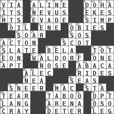 ACROSS 1. By way of 4. Place in a line 9. Capital of the state of Qatar 13. It is 14. Congenital growth or mark on the skin 15. Makes supply last 16. Mountains (abbr.) 17. Elude 18. Simple or foolish person 19. Petroleum 21. Compass dir. 22. Off-Broadway awards 24. Fly high 26. Distress signal 27. NE Massachussets city 29. Native of Scotland 30. Schedule 31. Actor Lugosi 33. Small child 36. Period of immesurable duration 37. Apple salad 40. Single 41. Fitting 42. Olfactory organ 43. Phillipine bananalike plant 45. Actor Baldwin 47. Amusement-park features 48. Teachers' org. 49. Oceans 50. Contemptuous expression 52. Apple computer (short form) 54. R.R. building 56. Separate forcefully 57. Off limits 59. Elect 61. Austrian-born American filmmaker Fritz 62. Sports stadium 63. Bear (Spanish) 64. Supercomputer manufacturer 65. Prevent from occurring 66. Part of a journey DOWN 1. Zeal 2. "Tell ____ the Marines!" 3. Helper 4. A saturated hydrocarbon 5. Prying instrument 6. _ the terrible 7. Unadorned 8. Compass dir. 9. Stop 10. Migrant worker of the '30s 11. Equivocates 12. Viper 20. Spoils 22. Motion picture award 23. Surprise greeting 25. Afresh 27. Toward the sea 28. Hoof sound 29. A type of plum 31. Group of countries in special alliance 32. Begley and Asner 33. Inedible or poisonous agaric 34. At one time in the past 35. Afternoon social gatherings 38. Approach 39. Conductor's collection 44. Prejudice 45. Disorder of the immune system 46. Area sheltered from the wind 49. Biscuitlike quick bread 50. Scorch 51. Nanny 52. Female horse 53. Collude with 55. Domed church section 56. Affectionate concern, for short 57. Small amount or degree 58. Rowing implement 60. Coat; cloak