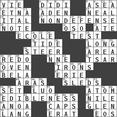 ACROSS 1. Compete 4. "You Light Up My Life" star Conn 8. At sea 12. Inactive volcano in Sicily 14. An important port of Yemen 15. Anneal 16. Slanted text style (abbr.) 17. Unrelated to defense, as in spending 20. Observe 21. Bear (Spanish) 22. Had dinner 23. Learning spot: Fr. 27. Trial 29. Event that recurs at intervals 31. Yearn 34. Navigate 35. Length times width 36. Do over again 39. Compass dir. 41. Russian ruler of old 42. Baking chamber 43. Removes the wrinkles 46. Actor Lugosi 47. 4th largest of the Great Lakes 48. Caspian sea tributary 51. Bobsleighs 54. Arrange properly for use 56. Nilotic language 58. Smallest unit of an element 61. The property of being fit to eat 66. Mediterranean tributary 67. Small Philippine buffalo 68. Smile enhancers 69. Small, secluded valley 70. Long (Scottish) 71. Part of Q.E.F. 72. Greek goddess of the dawn DOWN 1. Distinctive style or manner 2. "Tell ____ the Marines!" 3. Related on the mother's side 4. One of the 12 tribes of Israel 5. Wedding promise 6. Lair 7. Southeast Asian peninsula 8. A saturated hydrocarbon 9. Legislators 10. 90 degrees 11. Toward shelter 13. Actor Baldwin 18. Eastern Standard Time (abbr.) 19. Enemy 24. Baseball player Mel 25. Untruth 26. Genesis locale 28. Narrow boards 30. Bert's buddy 32. Teachers' org. 33. Slender fish 34. Echolocation 36. Director Reiner 37. Night before a holiday 38. Accusation by an informer 40. Blunders 44. Petroleum 45. Born 49. 100% 50. Institute legal proceedings 52. Mild oath, euphamism for damn 53. Vertical member of a panel or frame 54. Lick closed 55. Pulitzer Prize-winning author Ferber 57. At one time in the past 59. Margarine 60. Not women's 62. Paper or plastic container 63. Hearing organ 64. Health resort 65. Fast jet (abbr.)