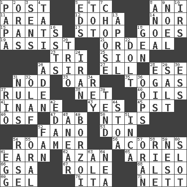 ACROSS 1. Mail 5. And so on (abbr.) 8. Black tropical American cuckoo 11. Length times width 12. Capital of the state of Qatar 14. Not either 15. Leg coverings 17. Constrict 18. Moves 19. Help 21. Severe or trying experience 23. Three (prefix) 25. The Jewish people; Israel 26. SW Saudi Arabia district 27. Pipe bend 28. Compass dir. 31. Lower and raise head in agreement 33. Rowing implement 35. Ancient Roman robes 37. General guideline 38. Fish or hair follower 40. Petroleums 41. Silly 43. Affirmative reply 45. Pacific Standard Time (abbr.) 46. Order of Saint Francis (abbr.) 47. Small moist lump or mass 50. Nuclear Threat Initiatives 52. Papal veil 53. Spanish title 54. Nomad 56. Oak nuts 61. Merit 62. Muslim summons to prayer 65. Satellite of Uranus 66. Girls' org. (abbr.) 67. Hero or heavy, e.g. 68. In addition 69. Set 70. Call ___ day 71. Remaining after all deductions DOWN 1. Dad 2. Mouths or openings 3. Elected reps. 4. Jacques of French films 5. Begley and Asner 6. Small child 7. Opt 8. Small Philippine buffalo 9. Christmas carol 10. Big collection agency 13. Showery time 16. Fast planes 18. Commissioned military rank (abbr.) 20. Musical group of three 22. Stupid person 24. SW Asia republic 26. Arabian gulf 28. The front part of a cuirass 29. Table seasoning 30. Double-curved letter 31. Religious women 32. Norwegian king 34. Marina Del _, California 36. I made a mistake 37. _ de Janeiro 39. Look after 42. Dutch treat 44. Portico 48. Approach 49. Tall, slender dog 51. South American Indian 52. Avid follower 54. To erase 55. Relating to the mouth 57. NW Algerian seaport 58. Cause heat under the collar 59. A home for chicks 60. Position in a hierarchy or organization 61. Oval reproductive body of a fowl 63. The first octave above the treble staff 64. Teachers' org.