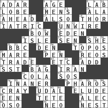 ACROSS 1. The sixth month of the Jewish calendar 5. Personal question 8. Experiment locale 11. Ear part 12. Not women's 14. Insect wing 15. At or in the front 17. In addition 18. Son of Odin 19. Of or pertaining to medicine 21. Undo the wiring of 23. Ribbon knot 25. Paradise 26. Small island 27. Elected rep. 28. A female animal or person 31. English channel? 33. Lair 35. Literary convention 37. Female horse 38. Animal enclosure 40. Vintage cars 41. Swap 43. And so on (abbr.) 45. Say or write further 46. Fast jet (abbr.) 47. Container for groceries 50. SW Asia republic 52. Root beer relative 53. Distress signal 54. More empty; more void 56. N Egypt peninsula 61. Supercomputer manufacturer 62. Freehold land 65. Dodge 66. Car or cant ending 67. False hair 68. Actor Baldwin 69. Bear (Spanish) 70. Modern: prefix 71. Egg locale DOWN 1. Jai _ 2. Capital of the state of Qatar 3. Collude with 4. Stern 5. Nanny (var.) 6. Set 7. Takes place subsequently 8. Cowardly lion portrayer 9. _ vera 10. Oblong piece of solid material 13. Something which is sent 16. Claim 18. Metal container 20. Lacking warmth 22. Left 24. Shed a tear 26. On the rocks 28. Drove too fast 29. Parka part 30. Double-curved letter 31. Drinking establishments 32. Naughty child 34. Born 36. Northwest Algerian city 37. Mountains (abbr.) 39. Nuclear Threat Initiatives 42. Inky black, to poets 44. Riding implement 48. Native American of Southwest Alaska 49. Place where plants grow 51. American tennis player Robert 52. Island 54. Angers 55. Billionth: prefix 57. Actor Alda or Thicke 58. Governing power 59. Lyric poems 60. Religious group 61. Corporate head (abbr.) 63. Had dinner 64. Lion