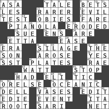 ACROSS 1. White ___ sheet 4. Falsehood 8. Wagers 12. French article 13. More uncommon 14. Tending to cause great harm 15. Trial 17. Off-Broadway awards 18. Conductor's collection 19. Player piano 21. Worn away 23. Take to court 24. Followers of ems 26. "We ___ not amused" (Victoria) 27. Singer James 28. Comfort 30. Epoch 31. Fodder prepared in a silo 34. Definite Article 37. Male child 38. Came up 39. Consenting reply 40. Fast jet (abbr.) 41. Food holders 42. Actress Charlotte 43. Electrical Unit 44. Constrict 46. Possessed 47. Biblical high priest 50. Nervous spasm 51. Threatening words 54. Pertaining to the sea 57. Small valley 58. Flower holders 60. Prepare for publication 62. Singer Brickell 63. Incident 64. Call ___ day 65. Carrot, for example 66. Indian skirt 67. Fish or hair follower DOWN 1. Keyboard modifier key 2. Ooze 3. Aide 4. Eating place 5. Believer in; advocate of (suffix) 6. Area sheltered from the wind 7. Celtic language 8. Prior to 9. Elude 10. Hoop that covers a wheel 11. Downhill vehicle 13. Friend of Pooh 16. Pulled tight 20. Teachers' org. 22. Raze (variant) 25. Gospel singer Marvin 27. Greek god of love 29. Eras 30. Double-curved letter 31. Table seasoning 32. Feeling or showing extreme anger 33. Car dealer's back yard 34. Polypeptide antibiotic 35. Pile 36. Compass dir. 41. Groovy apts. 43. Place for singles 44. R.R. building 45. Prong on a fork 46. Sun: prefix 48. Failure 49. Ancient Celtic tribe of eastern Britain 51. Baltic tributary 52. Make new 53. Nights before holidays 55. Eastern Standard Time (abbr.) 56. Quote 59. Actress Gardner 61. Make lace